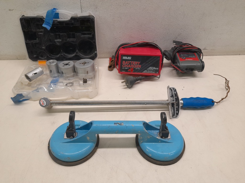Miscellaneous Tool Lot, Torque Wrench, Arlec 4A Charger, Suction Lifter, Hole Saw Set, Digital Gauge Note: Items are untested, hole saw set has missing parts Sold as lot
