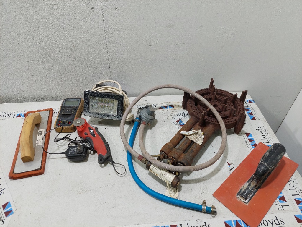 Assorted items, includes camp stove burner, 2 plaster trowels, digital multimeter, Skil multi cutter and light. Note: untested, signs of wear and tear. Mulimeter leads not included.