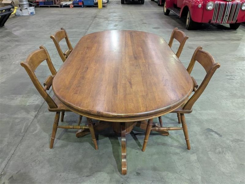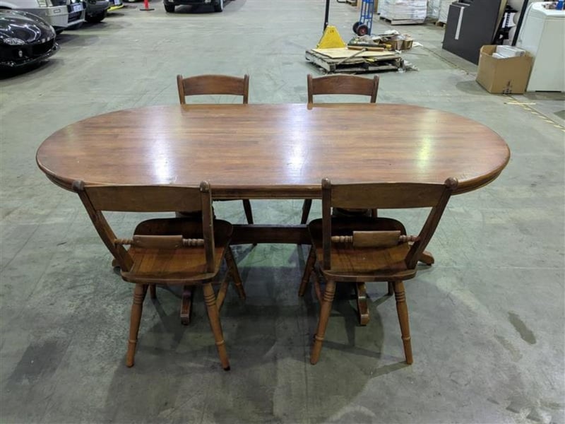 Timber Style Dining Table with 4 Chairs, Classic Oval Design, Warm Wood Look.