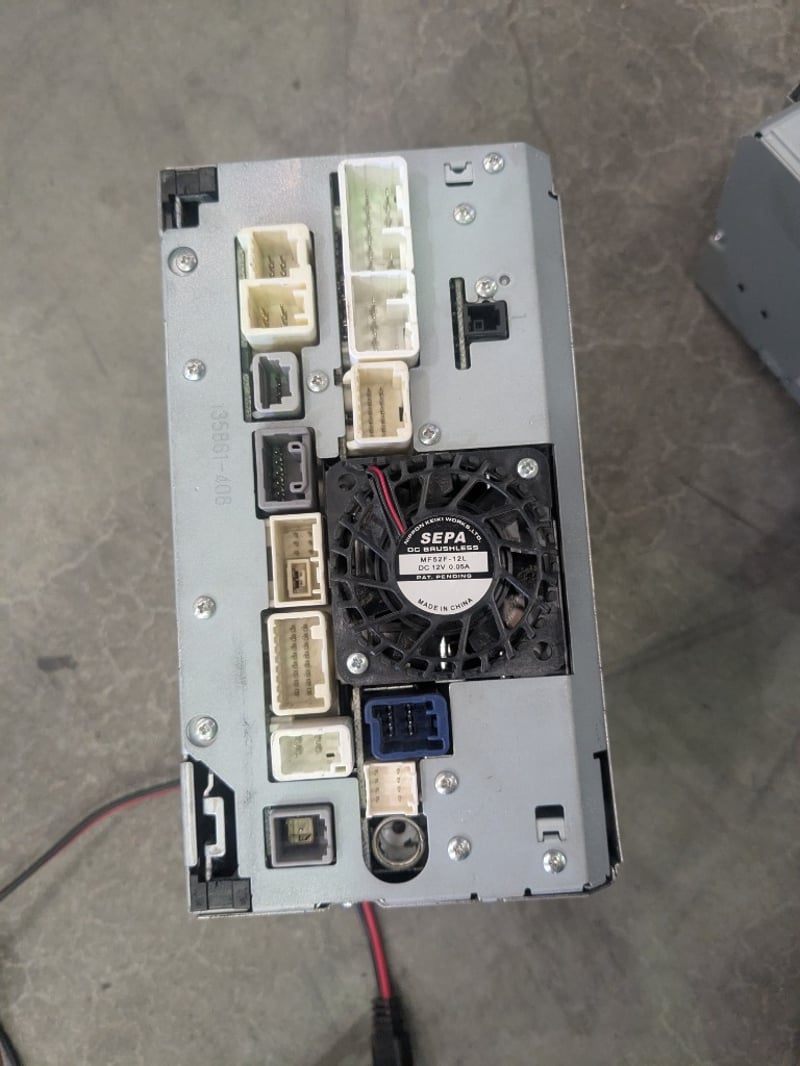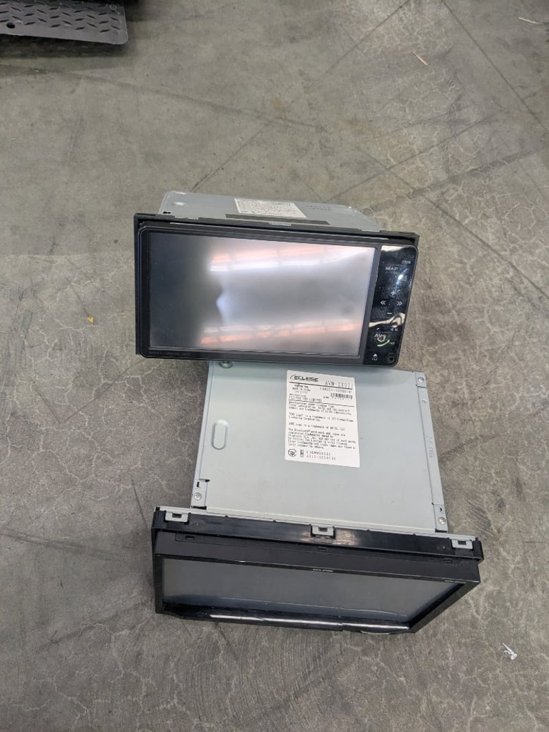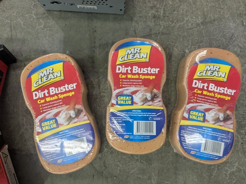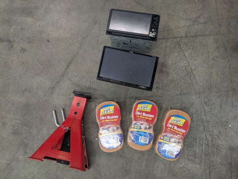 Assorted lot of car items including, car stereo screens, car wash sponge and jack.