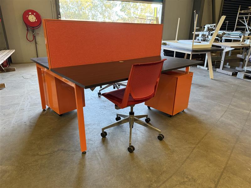Office Workstation Setup Workstation includes: 1x Double Desk with dark wood-style top & orange metal frame 1x Central Partition Screen 2x Under-Desk Mobile Drawer Units 2x Red Swivel Office Chairs on castor wheels Condition: Used, presents well with minor wear from regular use. Functional and ready for office setup.