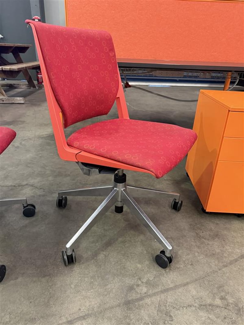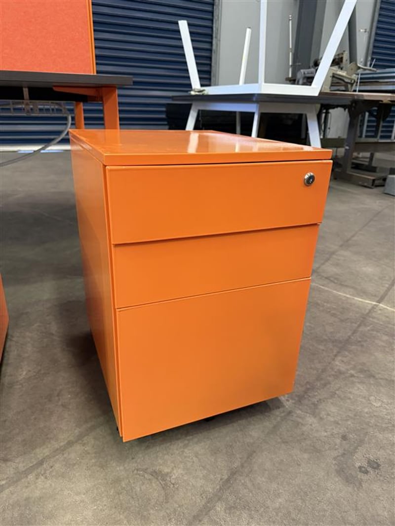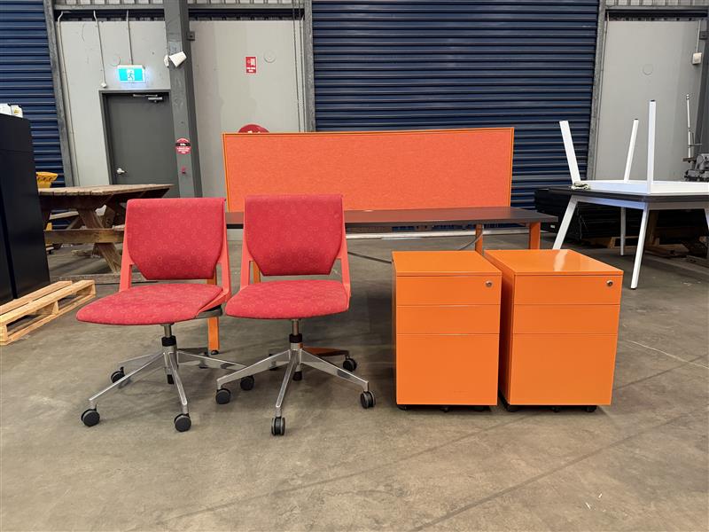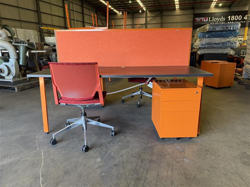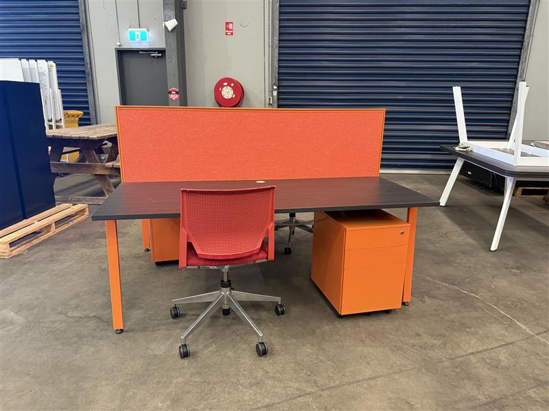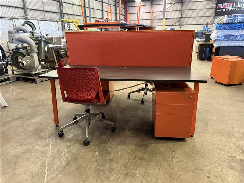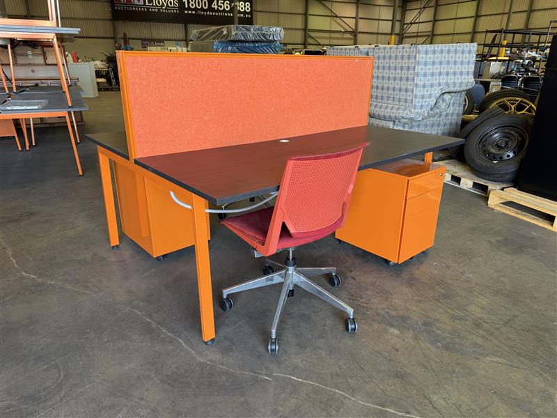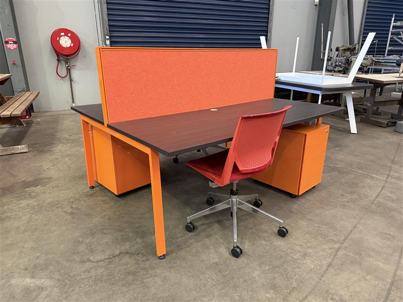Office Workstation Setup Workstation includes: 1x Double Desk with dark wood-style top & orange metal frame 1x Central Partition Screen 2x Under-Desk Mobile Drawer Units 2x Red Swivel Office Chairs on castor wheels Condition: Used, presents well with minor wear from regular use. Functional and ready for office setup.