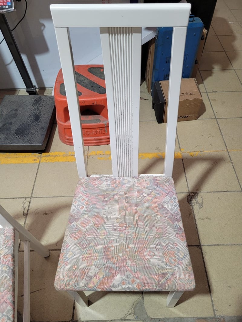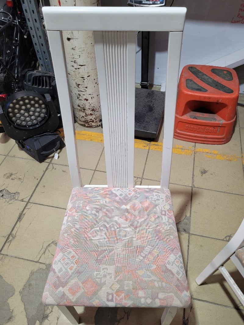 Dining Chairs x2, White Timber Finish, Multi Coloured Pattern FabricDimensions H:105cm W:43cm D:44cmSOLD AS LOT