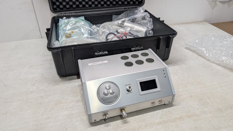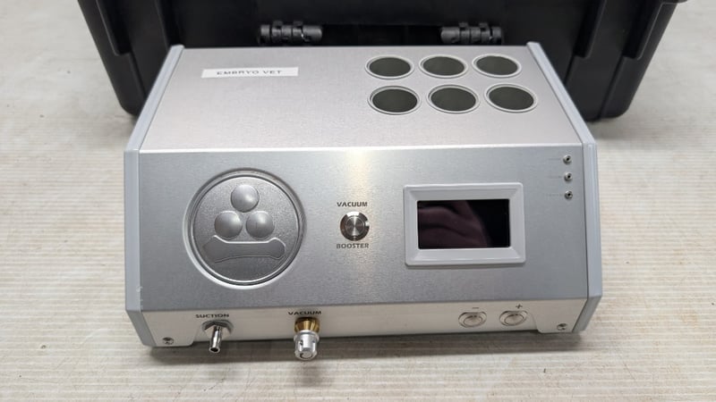 Embryo Vet Vacuum Pump, VACUUM PUMP FOR ASPIRATION W/ FOOTSWITCH & FILTER LINE (BOVINE), including: FOLLICULAR ASPIRATION LINE 1.2M W/ STOPPER (10 PACK) Vacuum Pump, an advanced equipment designed for precise Follicular Aspiration procedures. Experience seamless control with the wireless footswitch for convenient suction management. This innovative device seamlessly integrates a suction pump and heater into one compact unit.