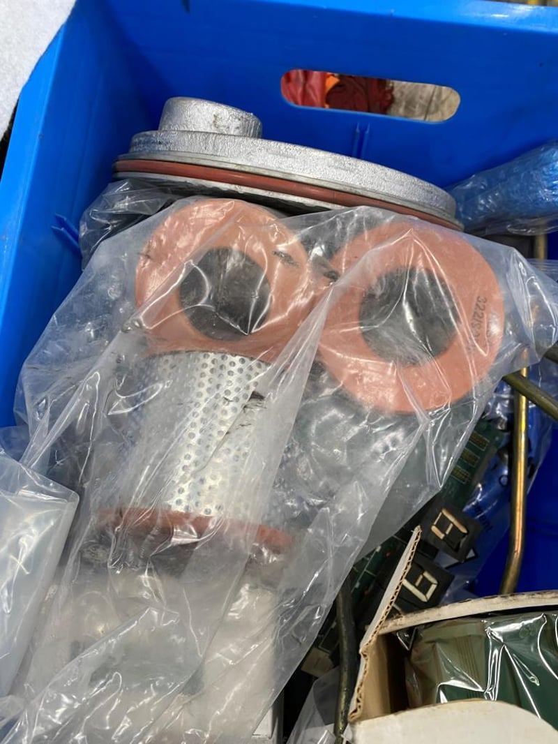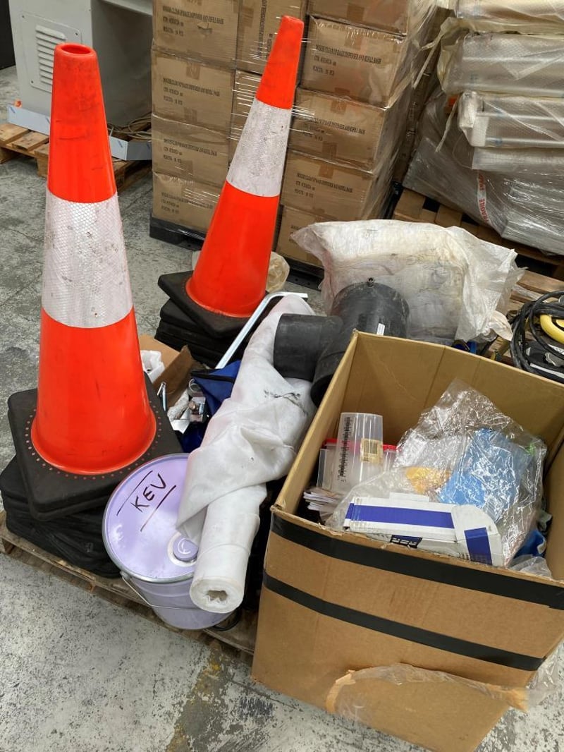 Assorted Tools/ Equipment including Fuel Filters, Traffic Cones, Air Valve hoses, Material, switch boards ect