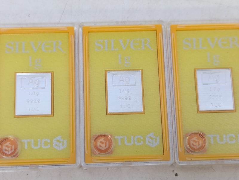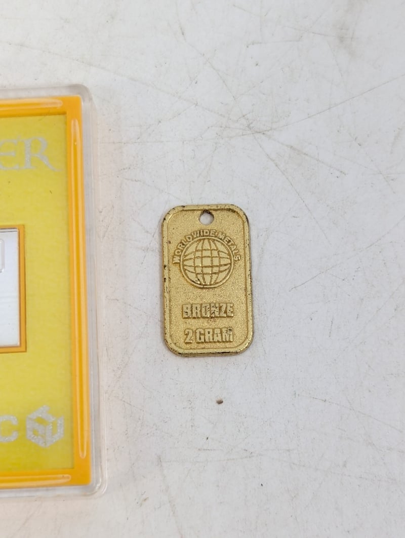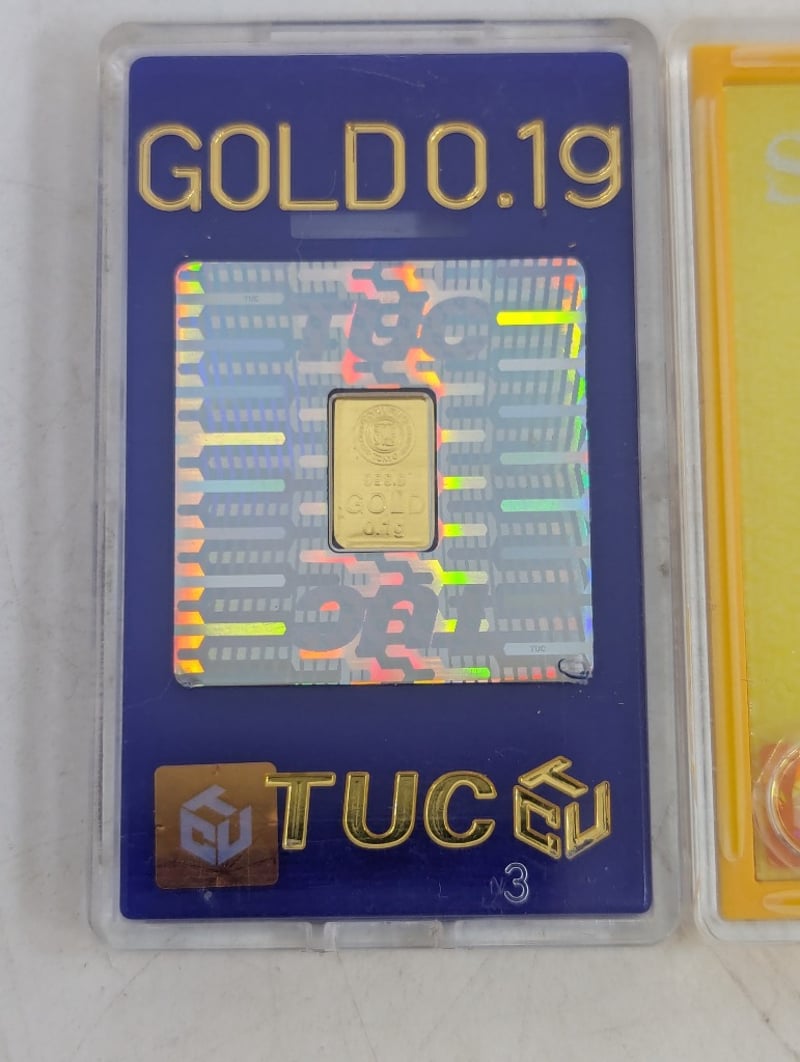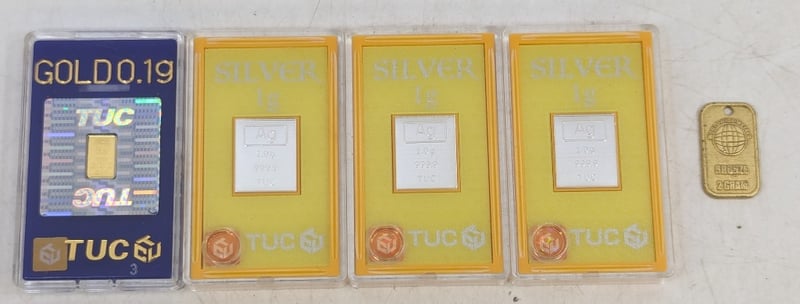 Collection of gold, silver and bronze bars, Includes: 0.1 gram TUC gold, 3x 1 gram TUC silver bar, 2 gram bronze barSold As Lot