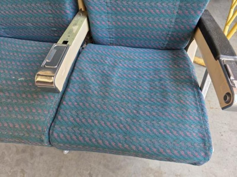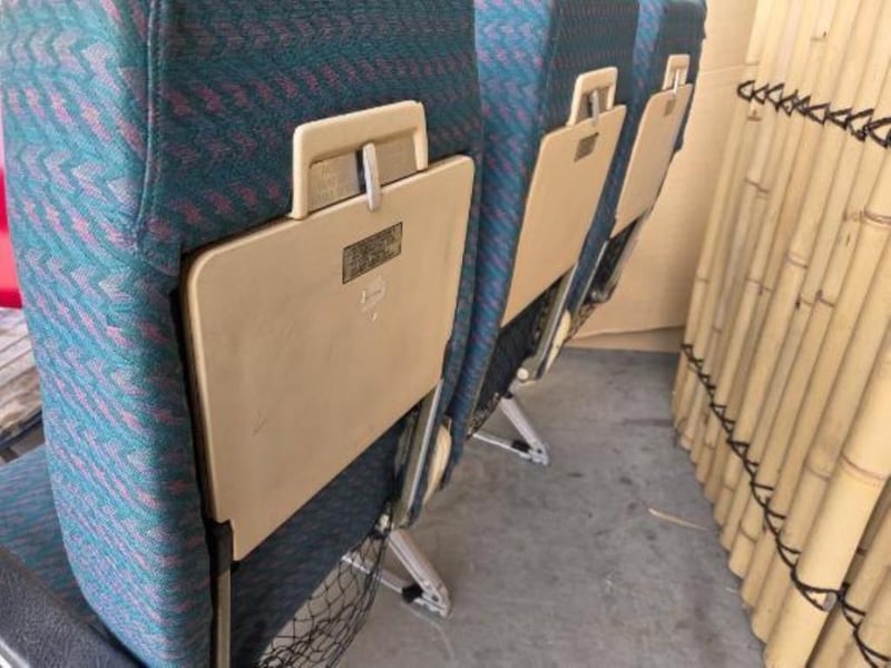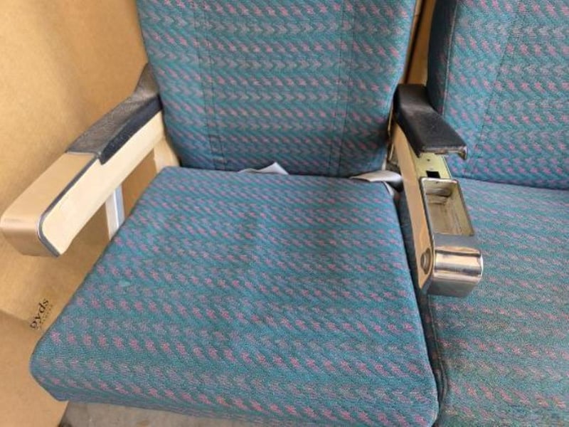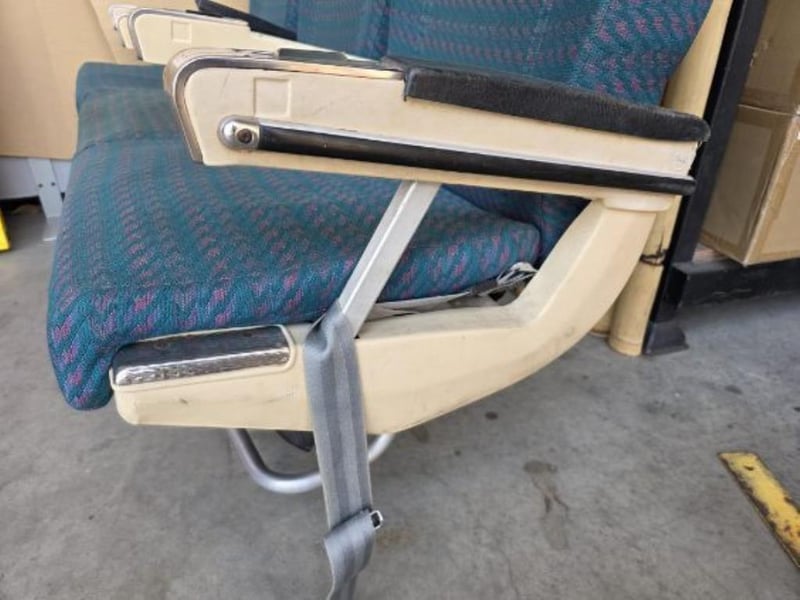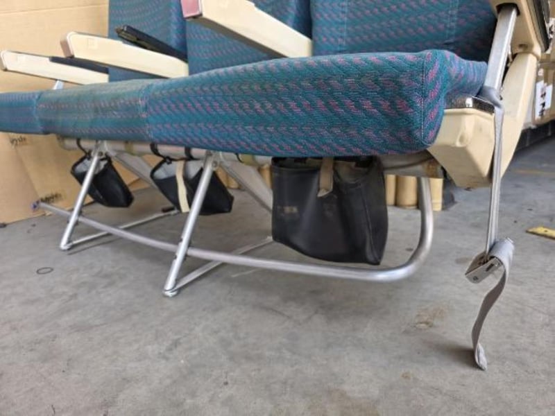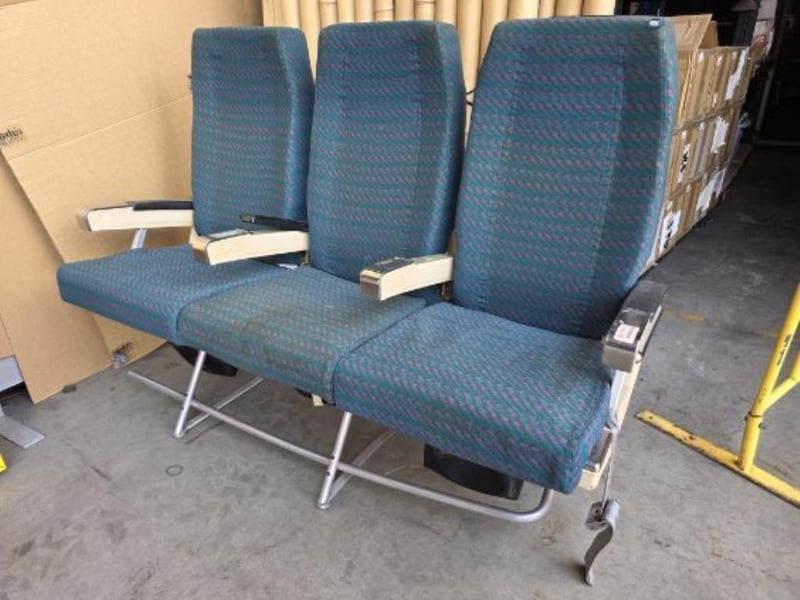Airplane Seats, Metal Frame, Fabric Cushions, row of 3 Dimensions: 1500mm(W) x 600mm(D) x 1100mm(H) NOTE: INSPECTIONS HIGHLY RECOMMENDED, MARKS AND STAINS Donated by Aviation Australia