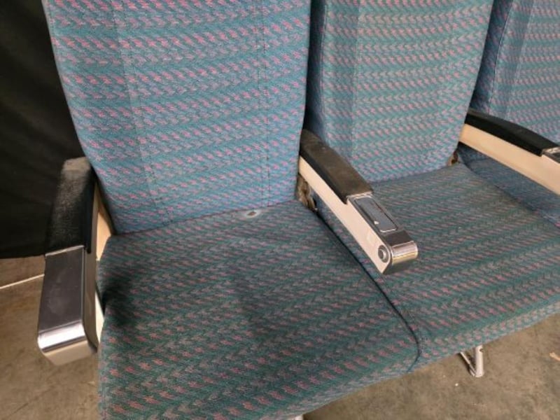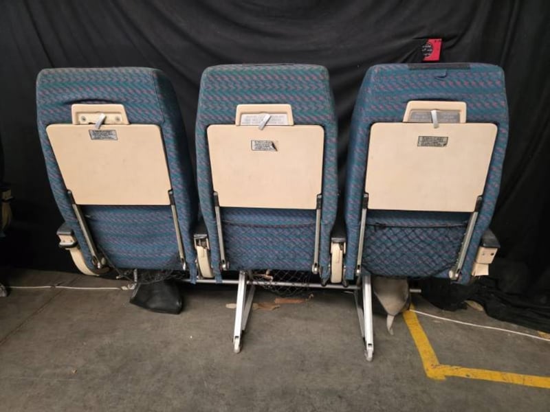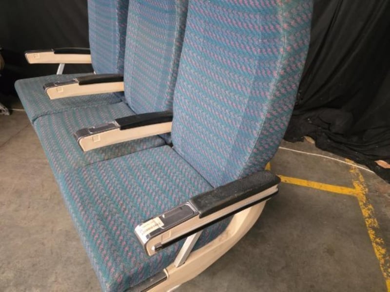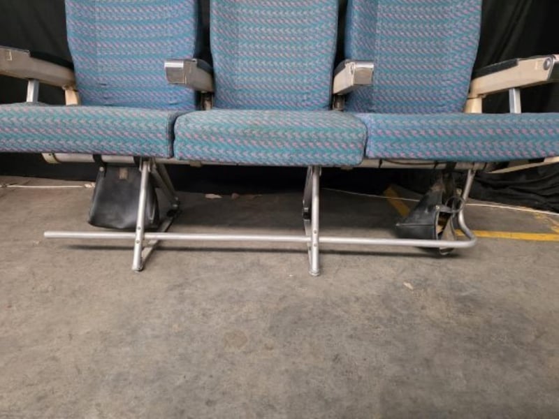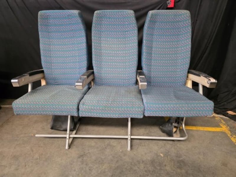 Airplane Seats, Metal Frame, Fabric Cushions, row of 3 Dimensions: 1500mm(W) x 600mm(D) x 1100mm(H) NOTE: INSPECTIONS HIGHLY RECOMMENDED, MARKS AND STAINS Donated by Aviation Australia