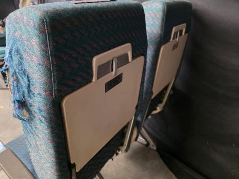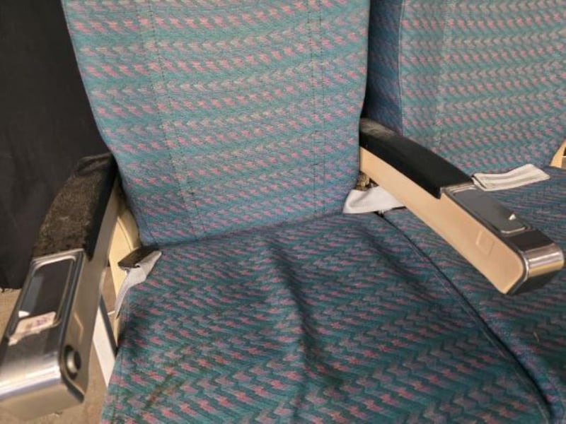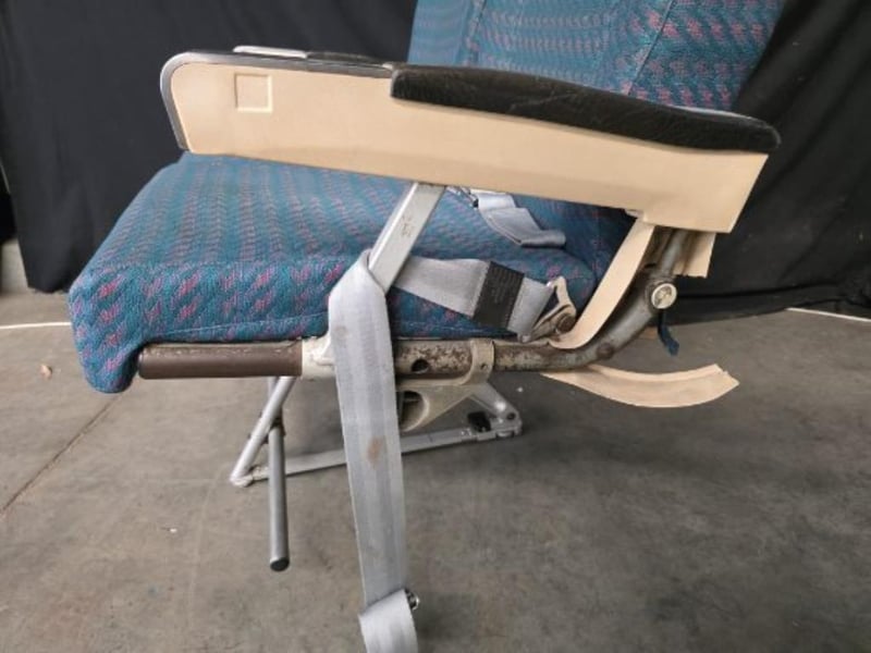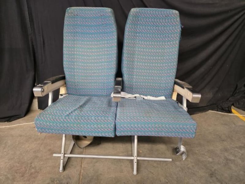 Airplane Seats, Metal Frame, Fabric Cushions, row of 2 Dimensions: 1020mm(W) x 600mm(D) x 1100mm(H) NOTE: INSPECTIONS HIGHLY RECOMMENDED, MARKS AND STAINS Donated by Aviation Australia