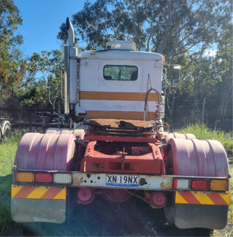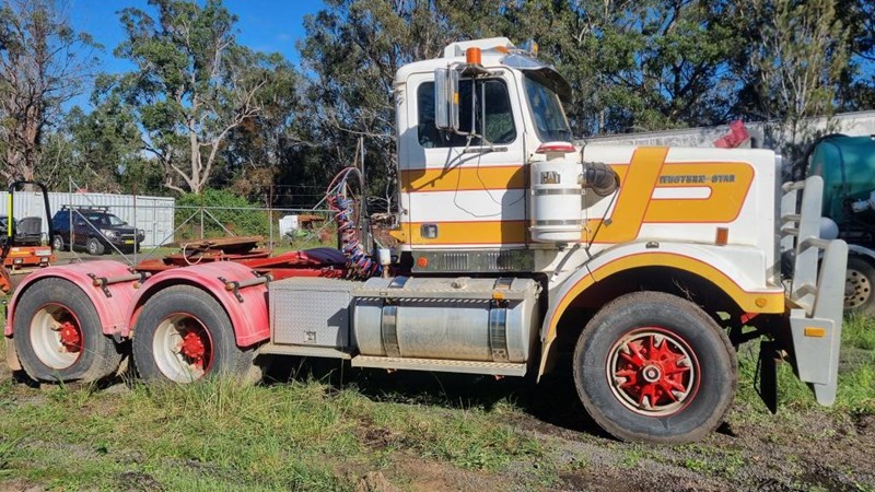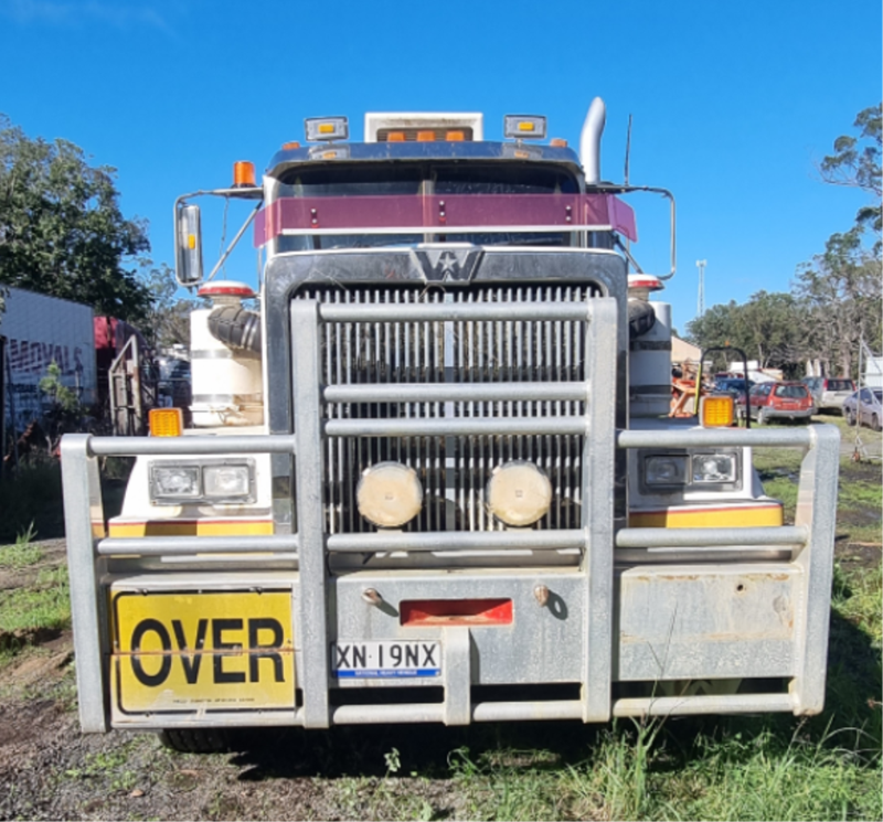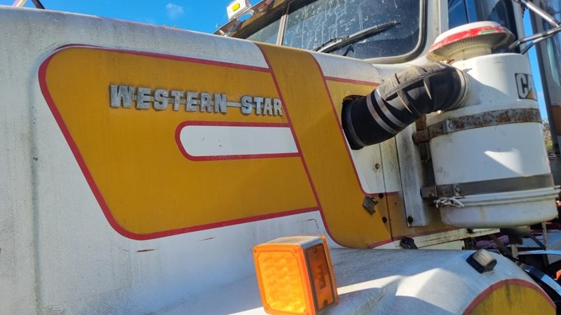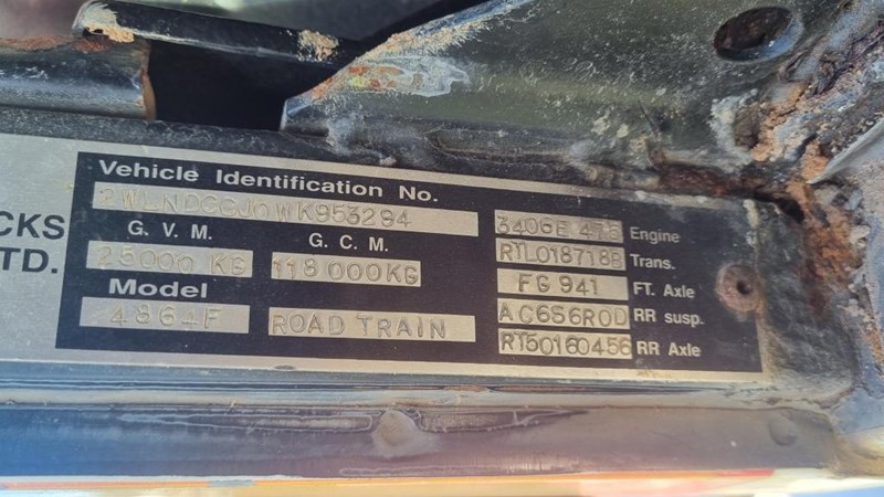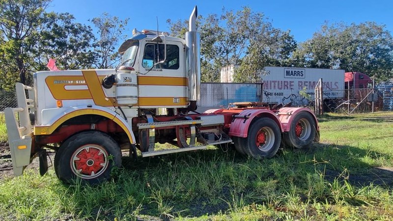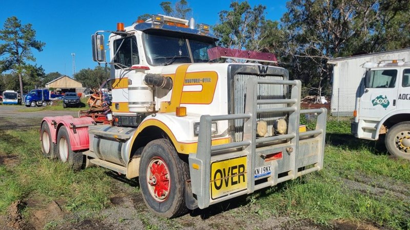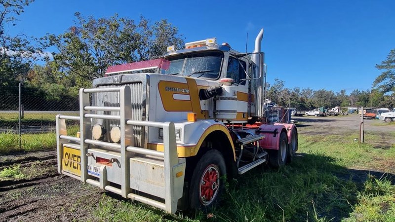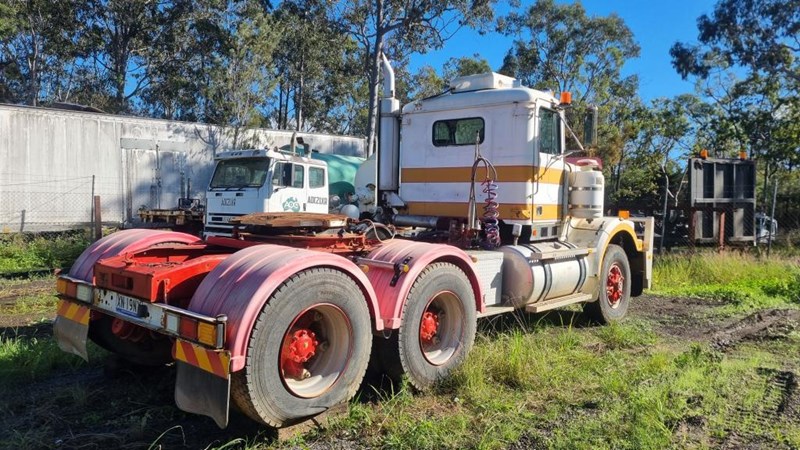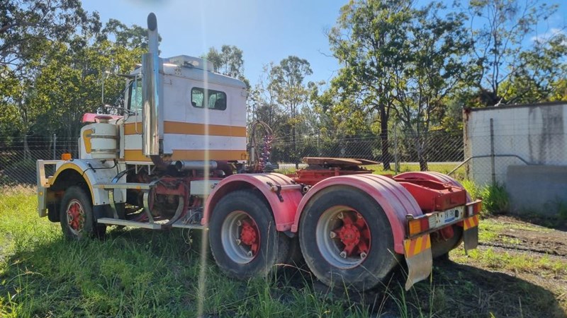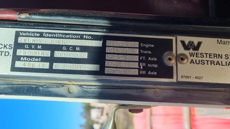 1996 Western Star 4864F Prime Mover Year: 1996 Make: Western Star Model: 4864F Type: Prime Mover Odometer: 914,928 Hour Meter: 1114.6 Configuration: 6x4 VIN: 2WLNDCCJ0WK953294 Drive Type: Manual Seats: 2 GVM: 25,000Kg GCM: 100,000Kg TARE: 9540Kg Engine: 3406E475 Description/Extras: Not Running, Located: Halfway Creek