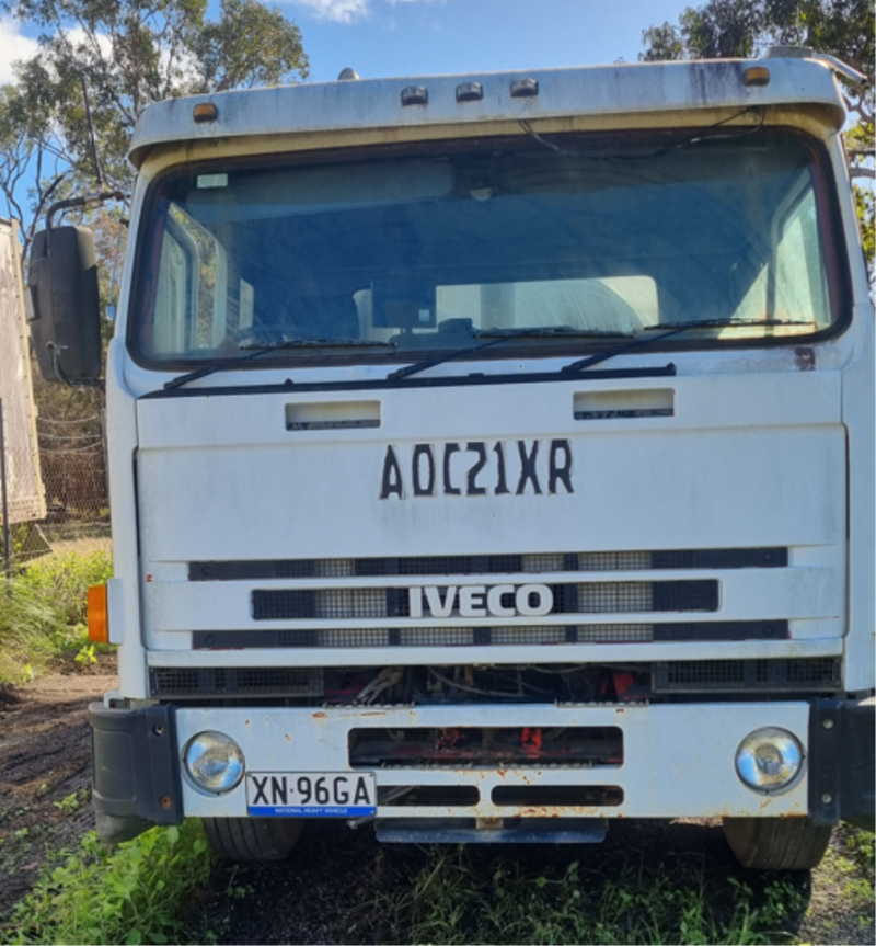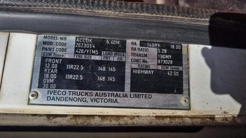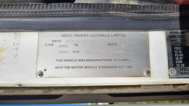 2004 Iveco Acco Agitator TruckYear: 2004Make: IvecoModel: AccoType: Agitator TruckOdometer Indicating: 298,728kmsHour Meter: 18,443.6Configuration: 8x4VIN: 6F22623004DL00031Seats: 3Description/Extras: Not RunningGVM: 30,000kgTARE: 10,620kgLocation: Halfway Creek