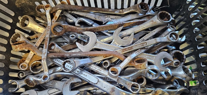 Tools, Including a variety of Spanners, different sizes, and types