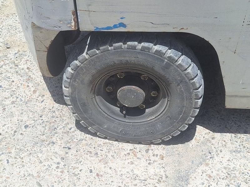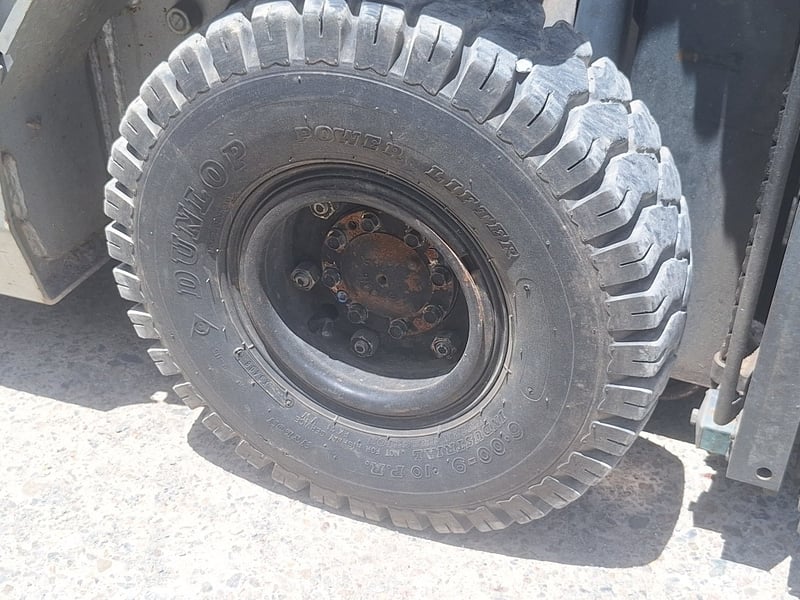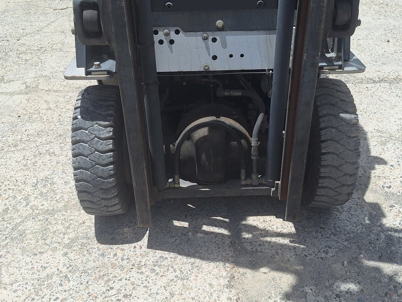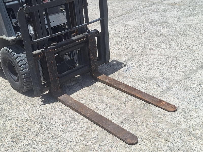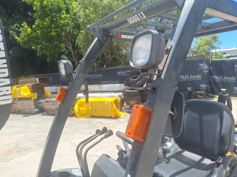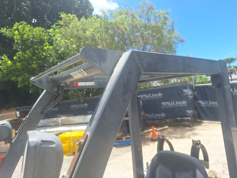Description/Extras: Solid Rubber Tyres, Dual Fuel/LPG, Side Shift, Manual Tyne Adjust, Max Lift Height 3000mm, Max Back Tilt 10 Degrees, 2-Stage Mast, Drive Lights, ROPS