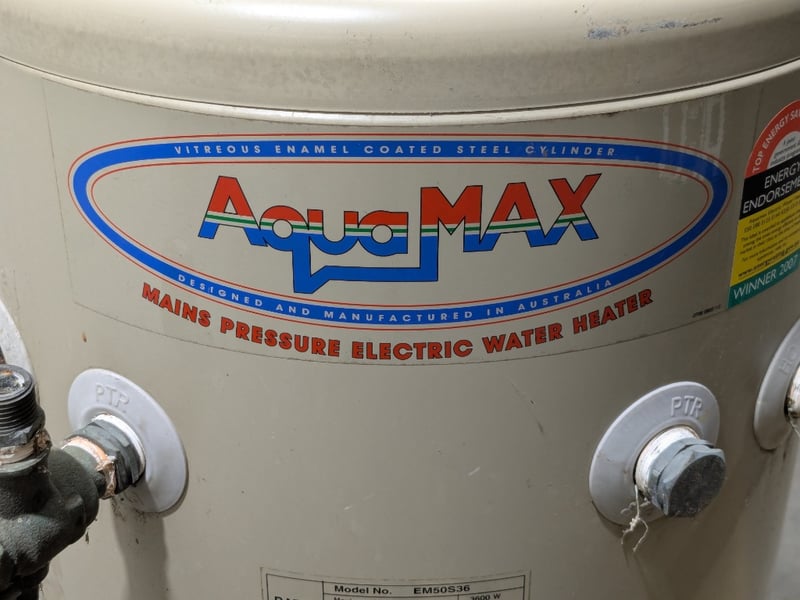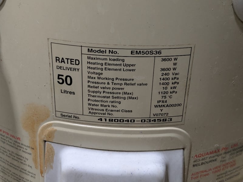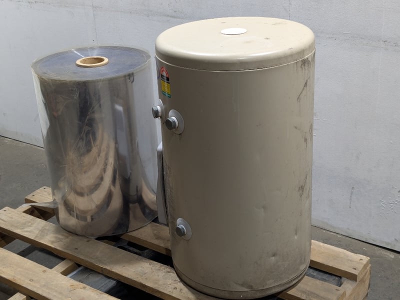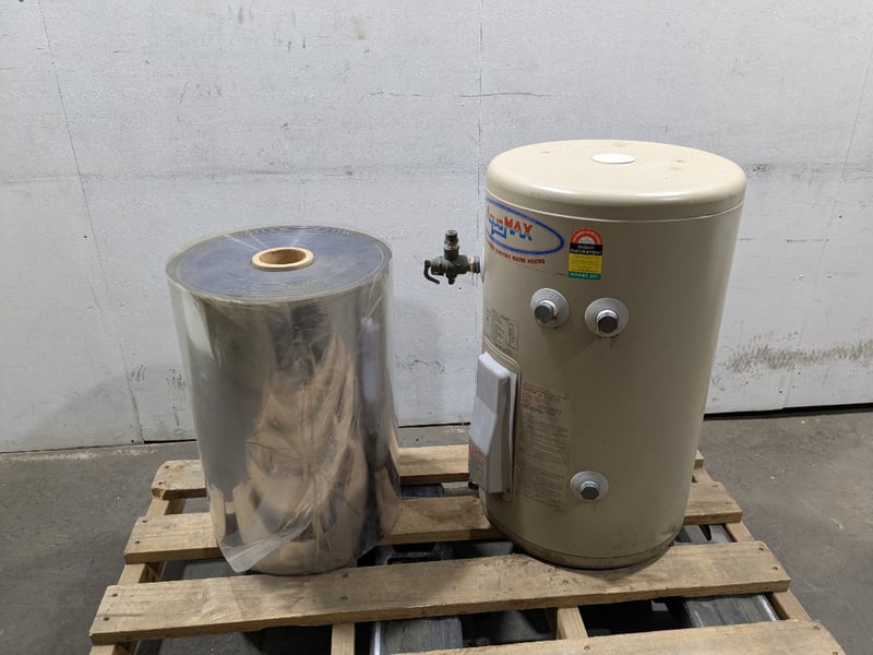 AquaMAX electric hot water storage heater, model no. EM50S36 and roll of industrial-grade transparent PET (polyethylene terephthalate) film.