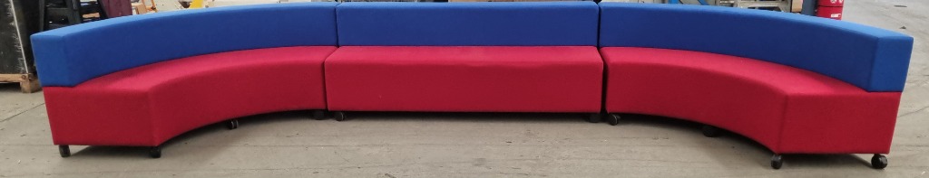 Lounge suite, modular,on castors, upholstered, red and blue. Curved piece 160 x 70 x 100 Middle piece 160 x 70 x 100 Sold as lot Note: Signs of wear and tear, broken wheel on straight chair( refer to pictures)