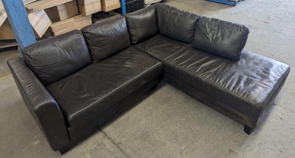 5 seater Spacious Dark Brown Leather Sectional Sofa – L-Shaped Comfort. Timber Base, Couch with chaise DIMENSIONS: 340cm X 60cm X 90Note: Signs of wear, Dust layer