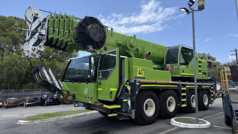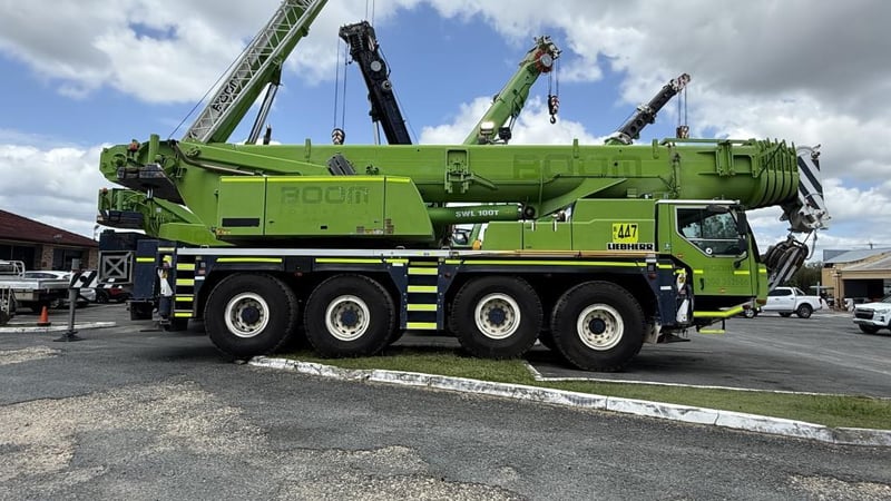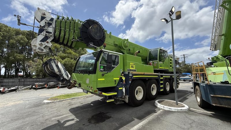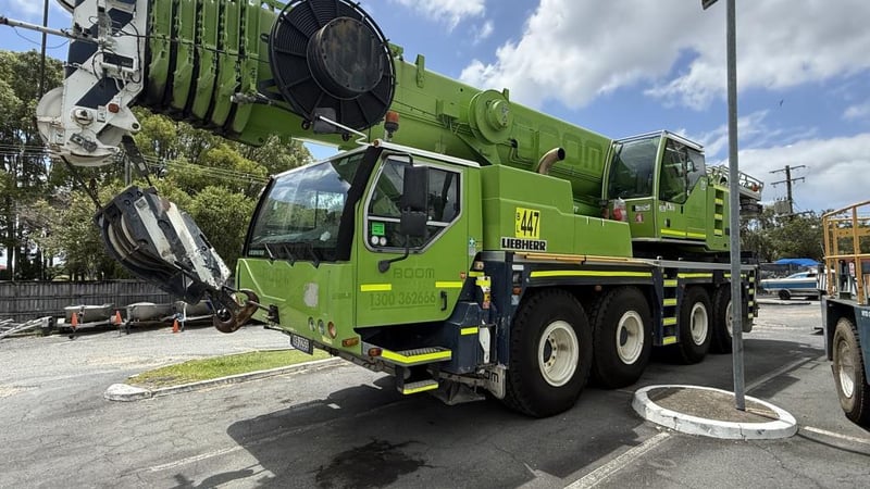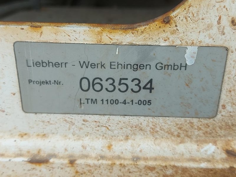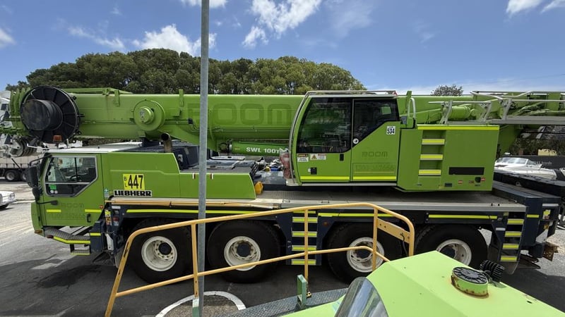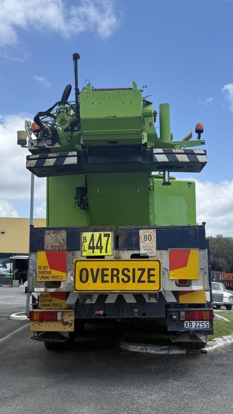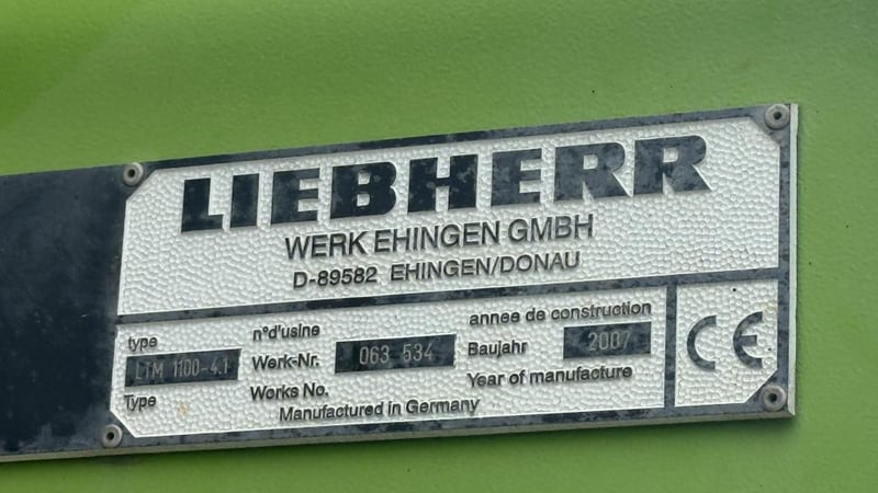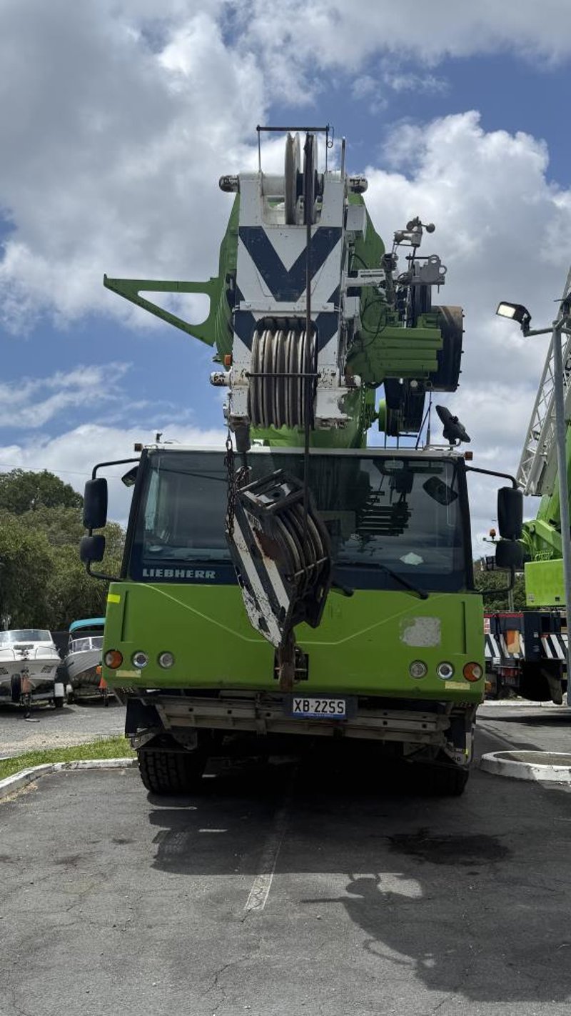 2007 Liebherr 100T All Terrain Mobile Crane Date of Manufacture: 2007 Make: Liebherr Model Name & Number: LTM 1100-4.1 Next Inspect: 12/07/2027 Next Major Inspection: 12/07/2032 Type: All Terrain Cabin: Enclosed Odometer: 177,989 km (indicating) Lower Hours: 9,429 hrs (indicating) Upper Hours: Not displayed Carrier Engine: Mercedes-Benz OM501LA – 11.9L V6 Turbo Diesel – 390 kW (530 hp) Transmission: ZF AS-Tronic automated gearbox, 8×8 all-wheel drive Hydraulic System: Twin variable-displacement axial piston pumps, 350-bar load-sensing system 2 hoist winches, hydrostatic slew drive, LICCON crane control Crane Engine: Mercedes-Benz OM904LA – 4.25L turbo diesel (dedicated hydraulic engine) Colour: Green Description: Fly & needle jib COUNTER WEIGHTS included: 10.5T 1.4T 1.75T 3.0T Serial: 063534 Carrier VIN: W094747007EL05285