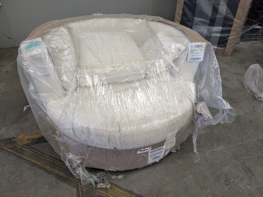 RRP$649 Valentina Round Lounge Chair in Coney Ivory. Dimensions : 90cm (H) x 110cm (W) x 110cm (D) Condition is new and wrapped but some Items Have Slight Scuff Marks & Stains, Some Items Marked Warehouse Rejected PARTS MAY BE MISSING, INSPECTION HIGHLY RECOMMENDED