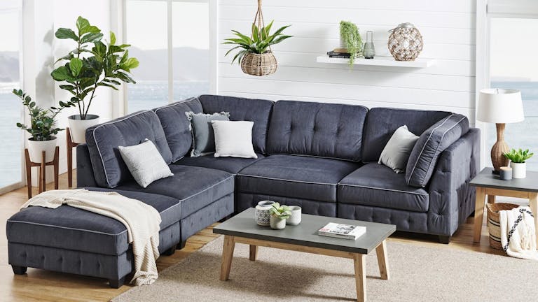 Fabric Modular Lounge Suite, Colour: Ebony, Includes OttomanDimensions: 3100mm (W) x 1010mm(D) x 930mm(H) NOTE: SOME CUSHIONS MISSING, LEGS NOT ATTACHED