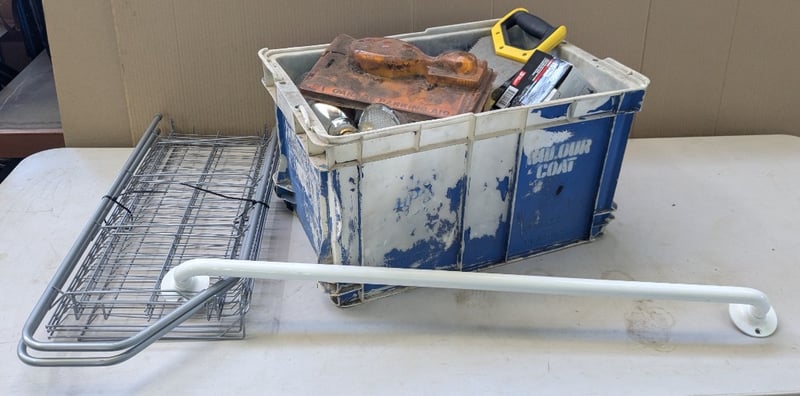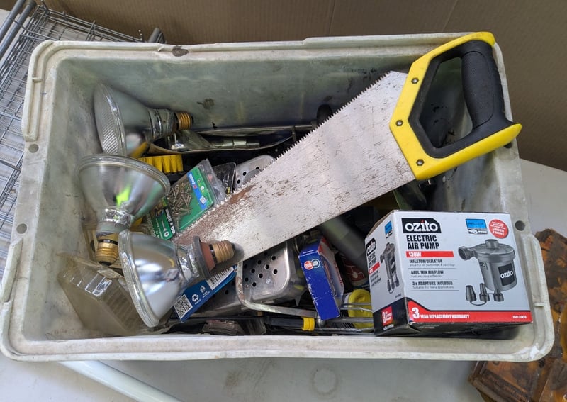 Hardware, Assorted Hardware Including Electric Air Pump, Hand Saw, Timber Screws, and more Sold as lot