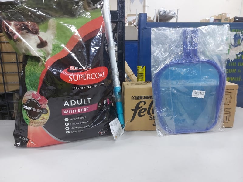 Assorted Lot containing, Dry dog food, Wet Cat food, Pool Skimmer and moreSOLD AS LOT