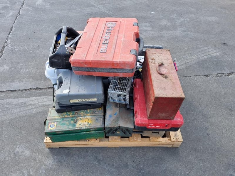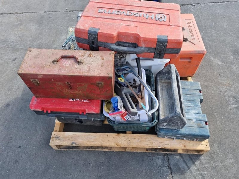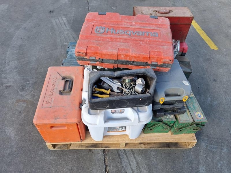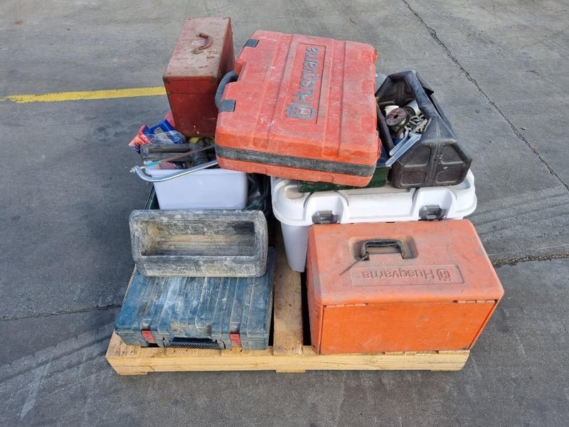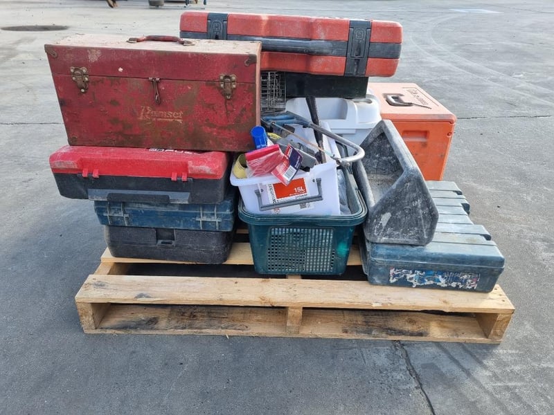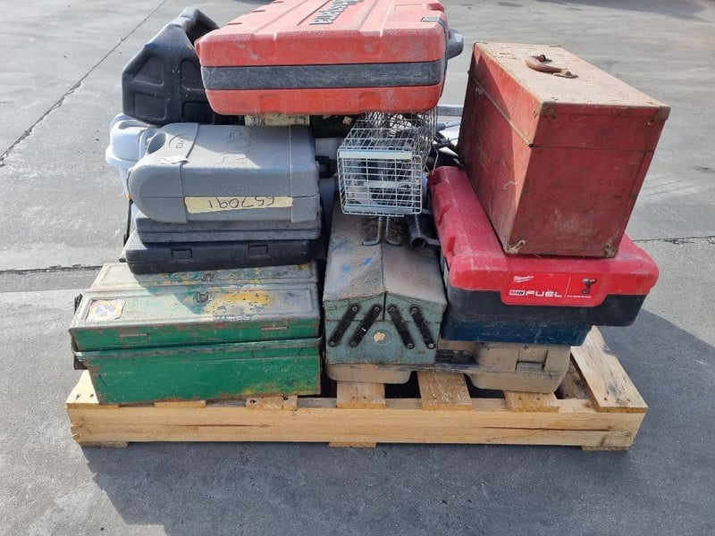 Pallet lot of tool cases, hand tools, and small tool carry boxes