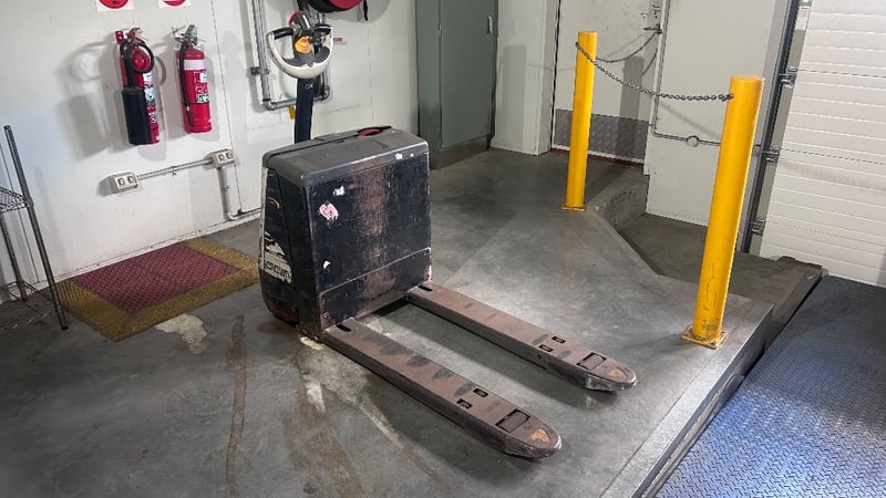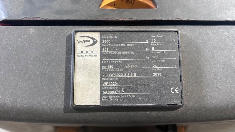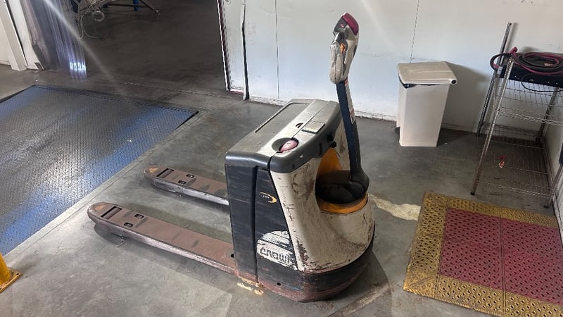 Electric Pallet Jack, Crown, Model:WP3020, Electric Pallet Jack Includes Charger.Dimensions: H:150cm x W:70cm x D:175cm.Sold As Lot.Note: Untested
