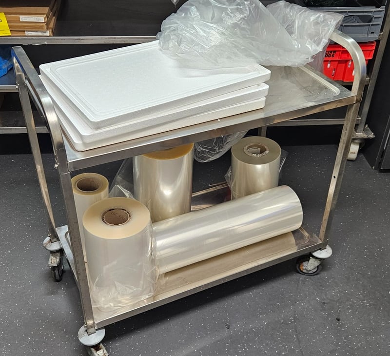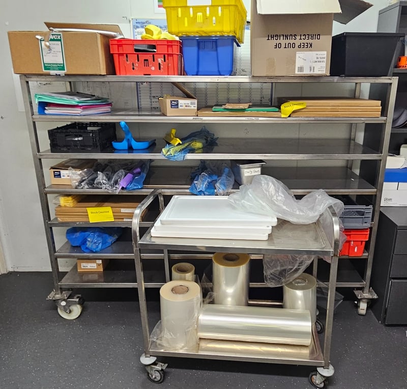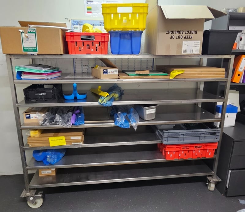 Shelving, Stainless Steel Shelving with Trolley and contents.Sold as lot