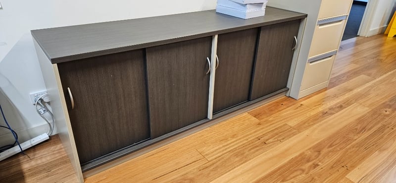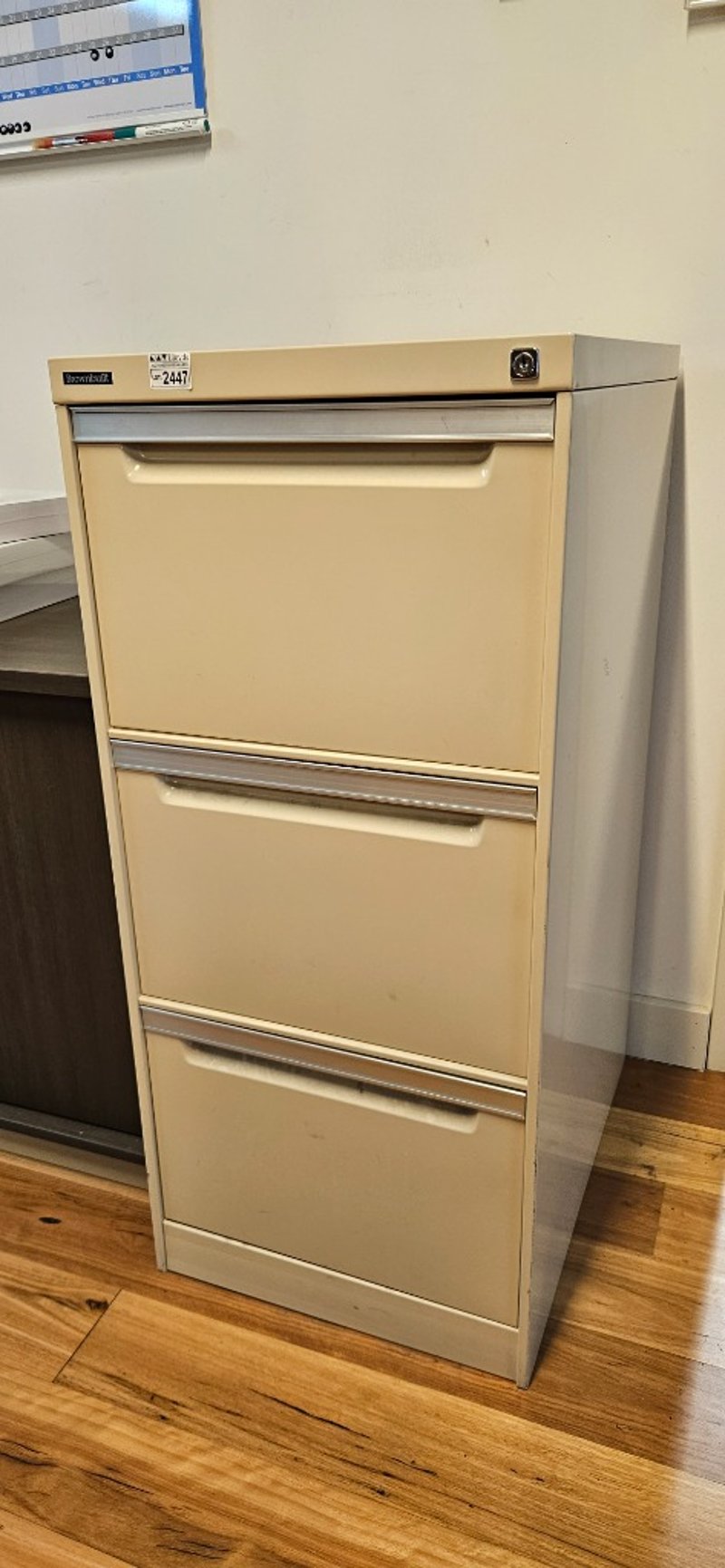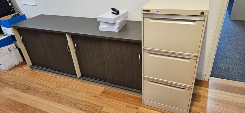 Office Furniture, Metal 3 Tier Filing Cabinet and Tmber Style Cabinet, contents included.