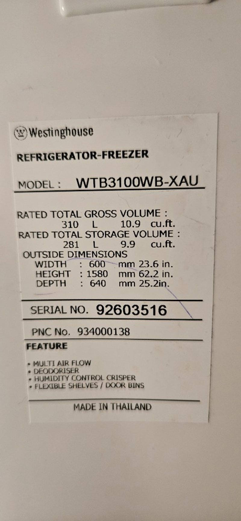 Fridge Freezer, Westinghouse Fridge Freezer, Model: WTB3100WB-XAUNOTE: Contents not included