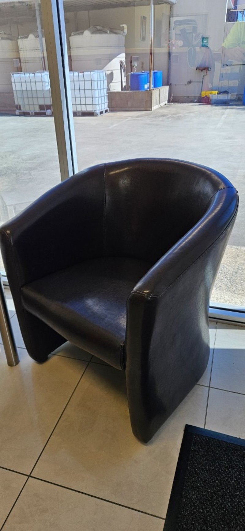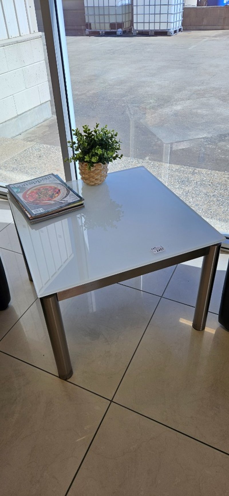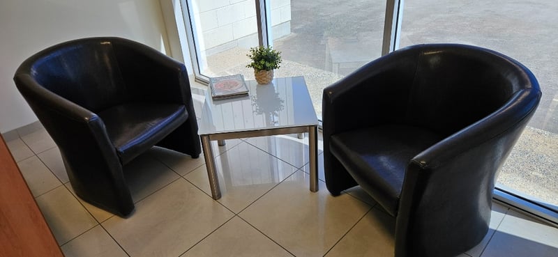 Furniture, 2x Leather Chairs with Square Glass Top Coffee Table W 60cm D 60cm H 45cm