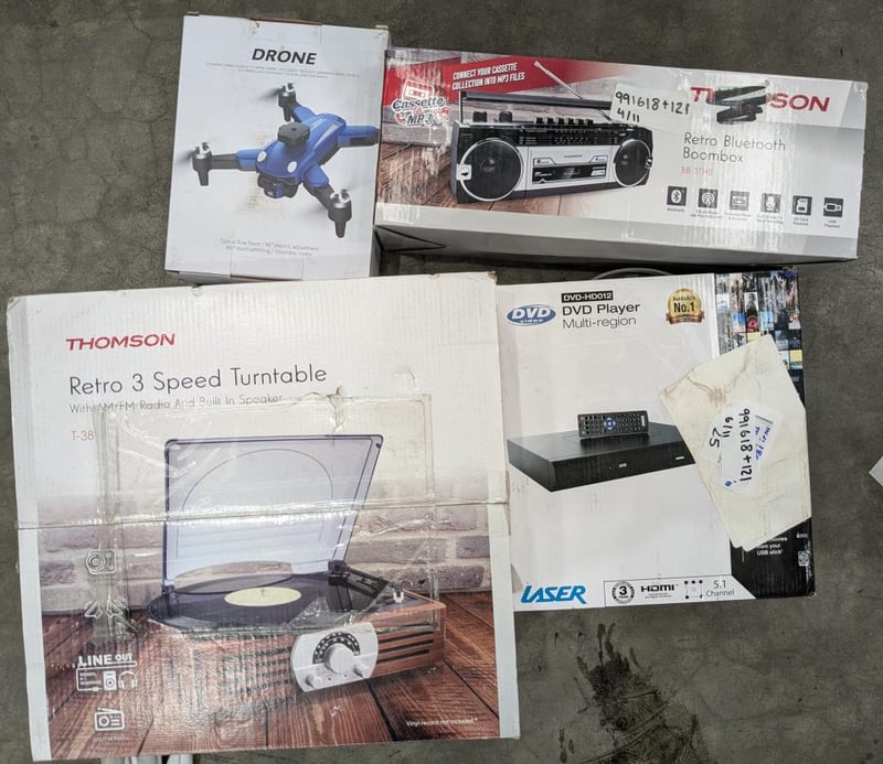 Assorted tech and entertainment, including; drone, boombox, tv, DVD player, turntable etc, brands include; Thompson, Apple, Blaupunkt etc, models include; F200, BB-3THB, T-38 etc Sold as lot