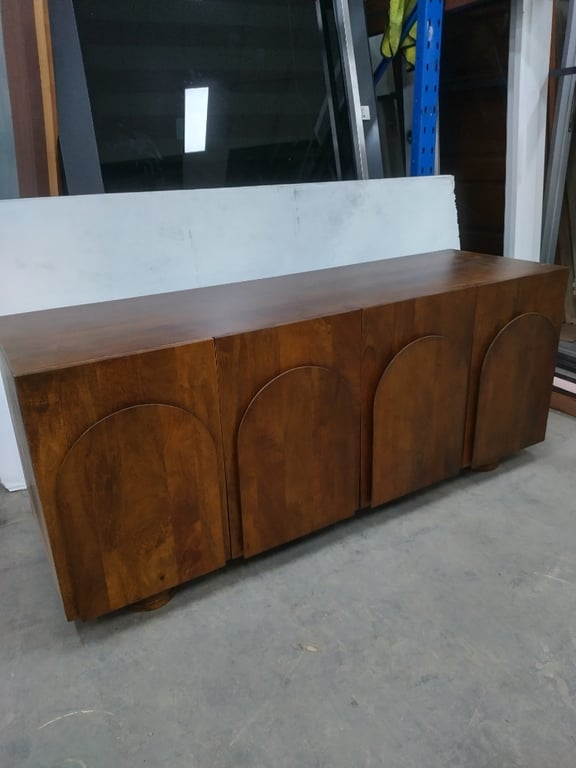 Brown finish, timber cabinet, opening doors, shelves Dimensions L150cm x W48cm x H64cm