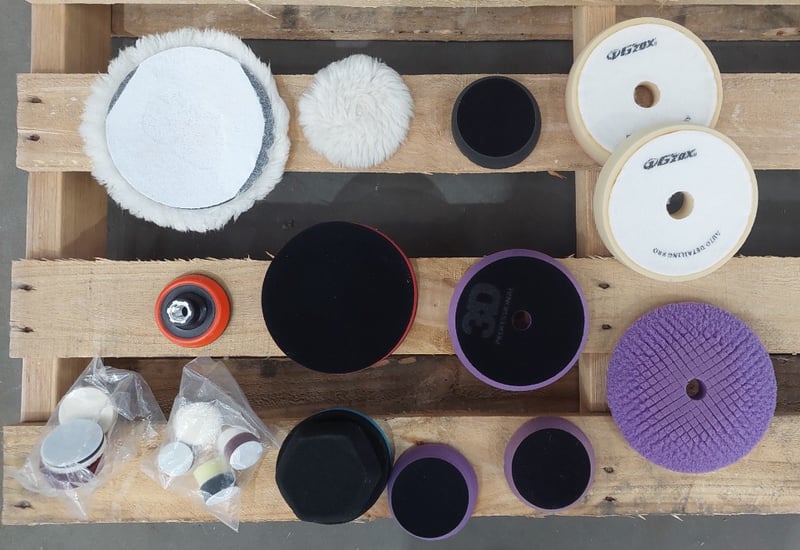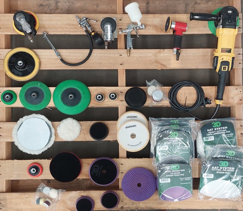 Assorted Wax & Polish Equipment, Polisher Dewalt DWP849X 180mm 1250W, Industrial Pneumatic Polishing Machine Air Sander Polisher, Random Orbital Sander 5" Sunshine Regultion 90 PSI, Premium Sander Bison 5" 90PSIG, Dual Chuck Dial Inflator 145 PSI RYOBI, Spray Gun 100 PSI Stan, Assorted Backing Plates, Assorted Foam Pads