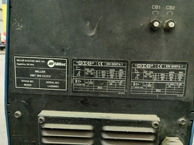 Miller DC Inverter Arc Welder, Mod: XMT 304, SN: LA 208663, MD: Ukn, 10Volt - 50Amp / 36Volt - 400Amp., Approximate Dimensions: H 42cm x W 28cm x D 60cm Note: Used Condition with Some Wear Note: Welder with Power Supply Cable Only Note: Untested