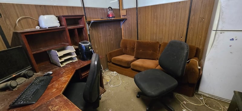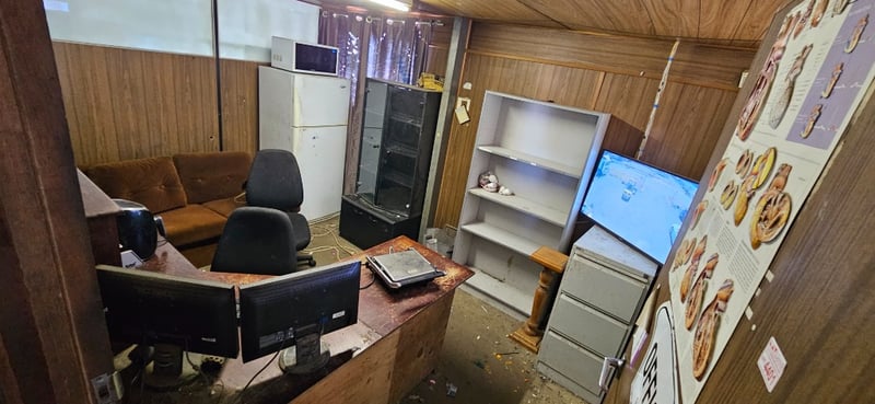 Office, Contents of room Including Desk, Fridge, Appliances, Lockers, and more Note: Monitor screens, TV not Included Sold as lot