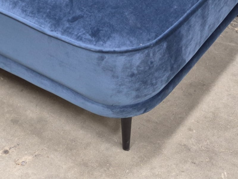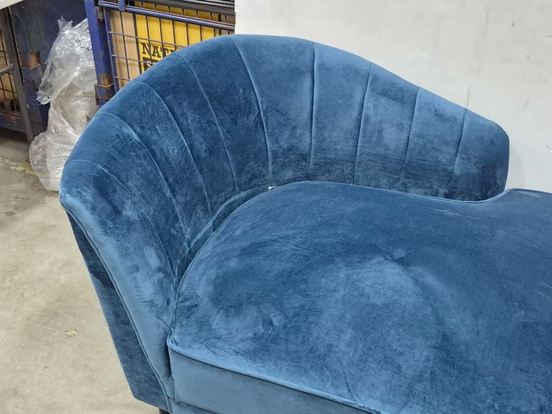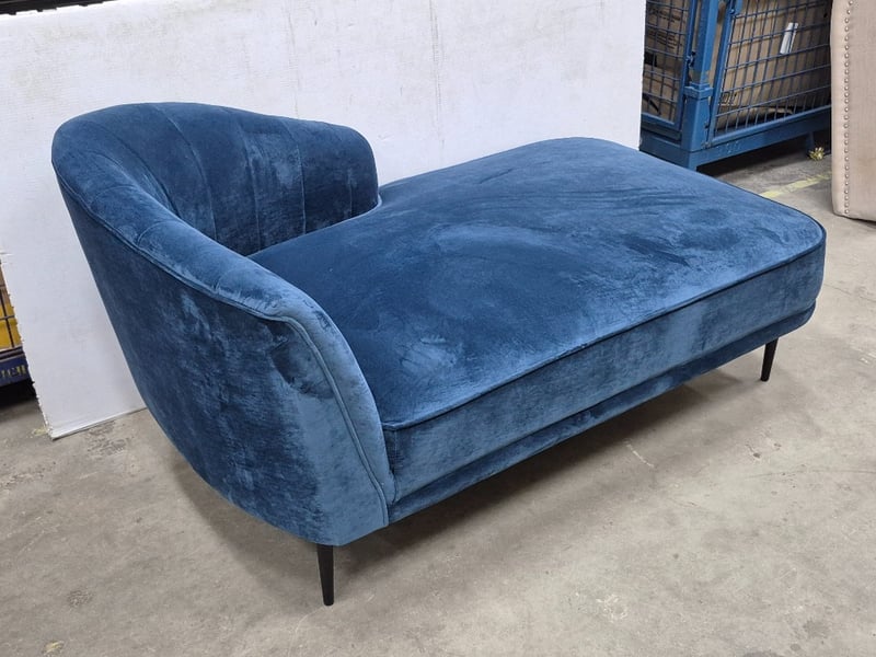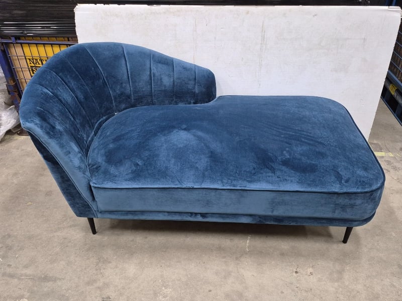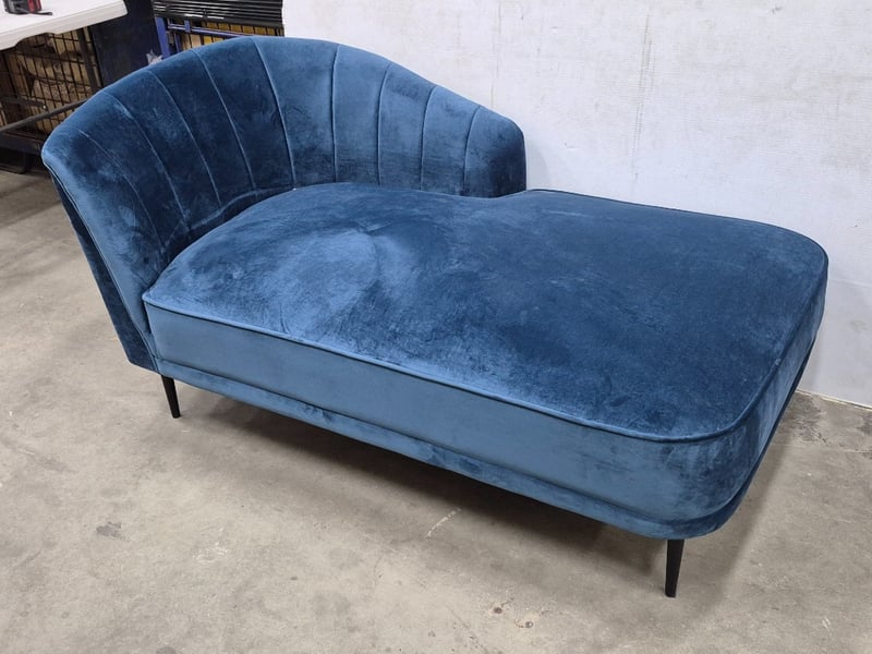Velvet Chaise Lounge, Navy Blue Upholstery, Black Metal Legs, Contemporary StyledDimensions: 150cm x 85cm x 77cm