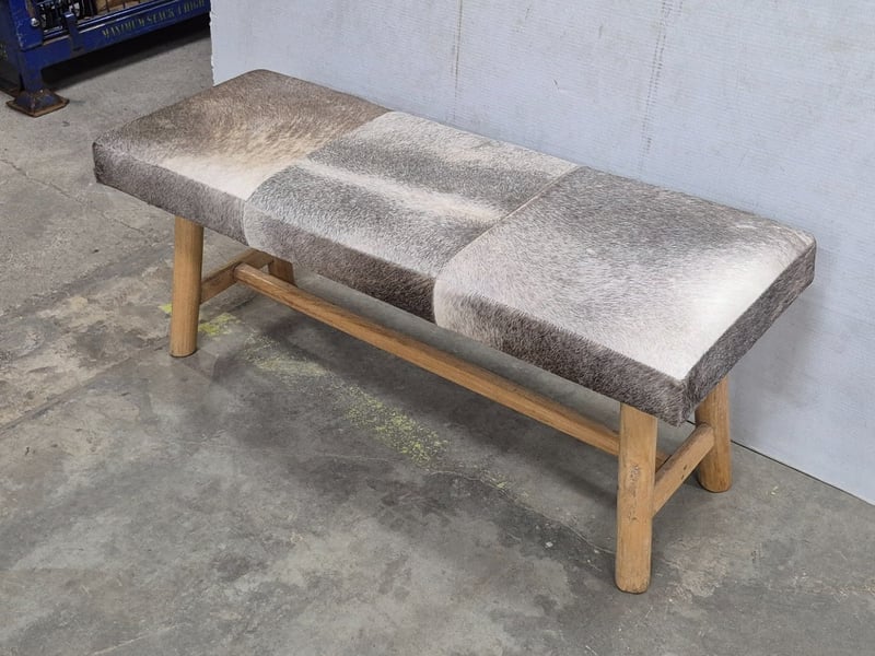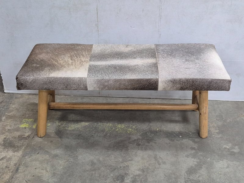 Bench, Rustic Style, Wood Base and Cowhide Style Upholstery