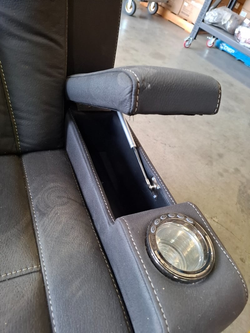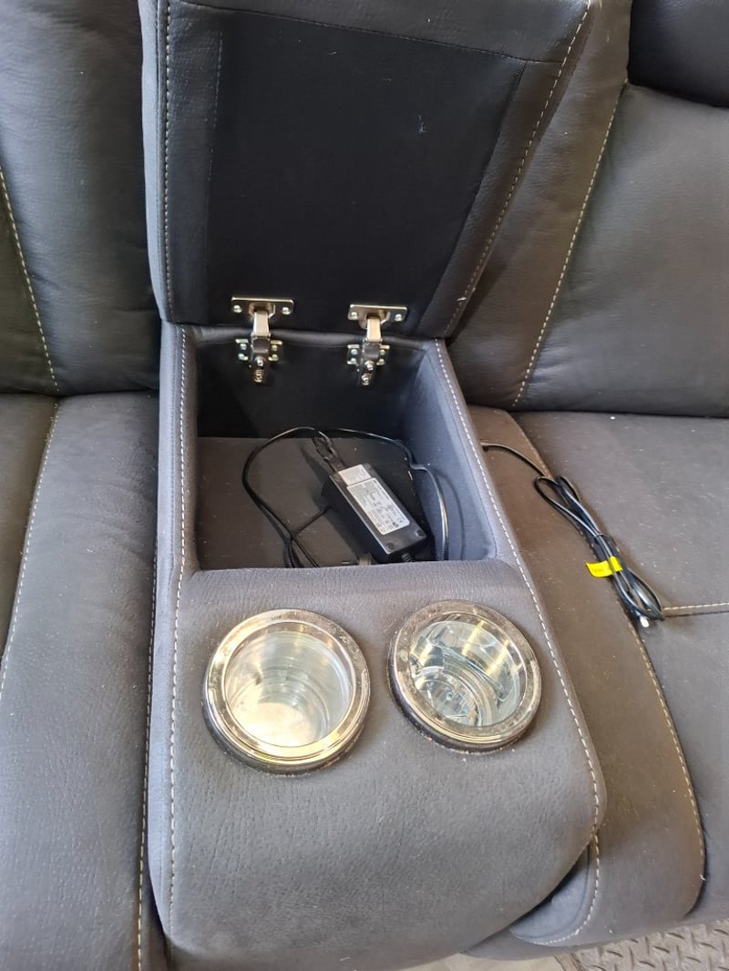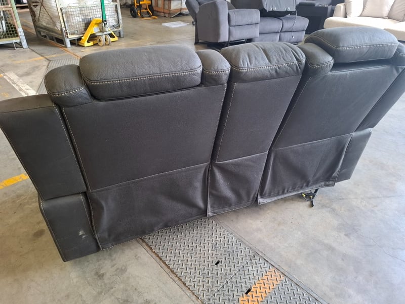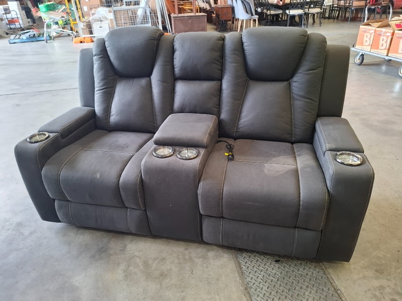 2 seater electric recliner charcoal leather style, 3 storage, 4 cupholders, Dimensions: 177 cm(W) x 95cm (D) x 110cm ( H)Note: minor cleaning required