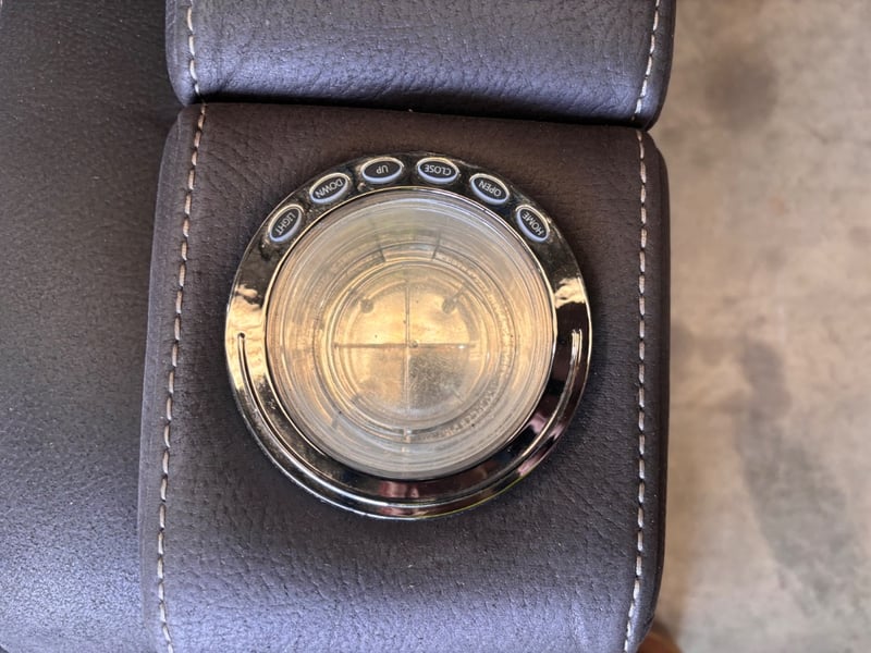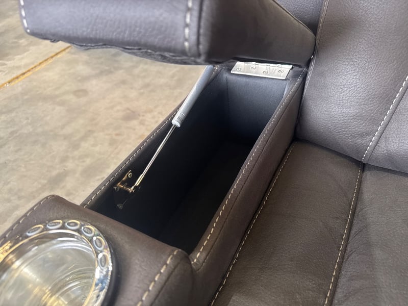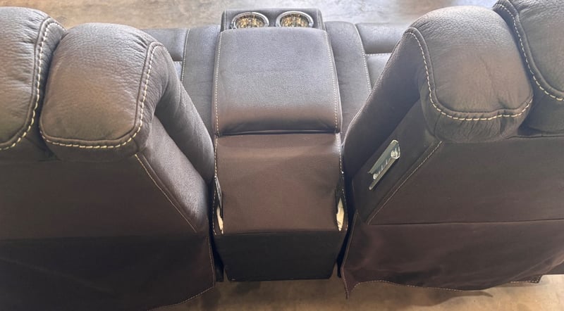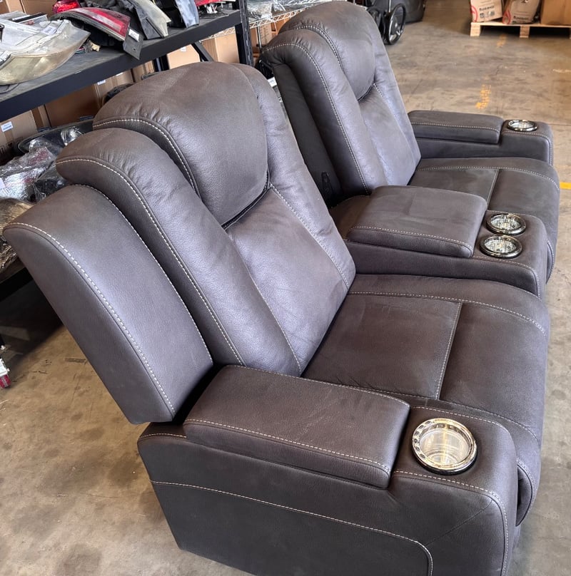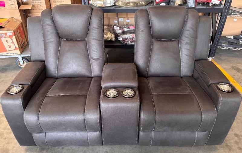 Two seater electrical lounge with 4 cup holders, LED lights, gas lift arm rests, 3 storage compartments, missing centre back piece