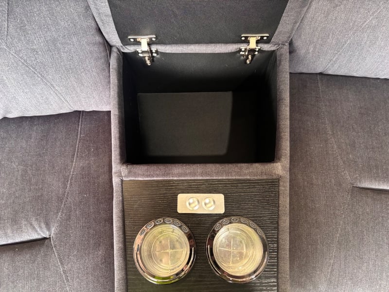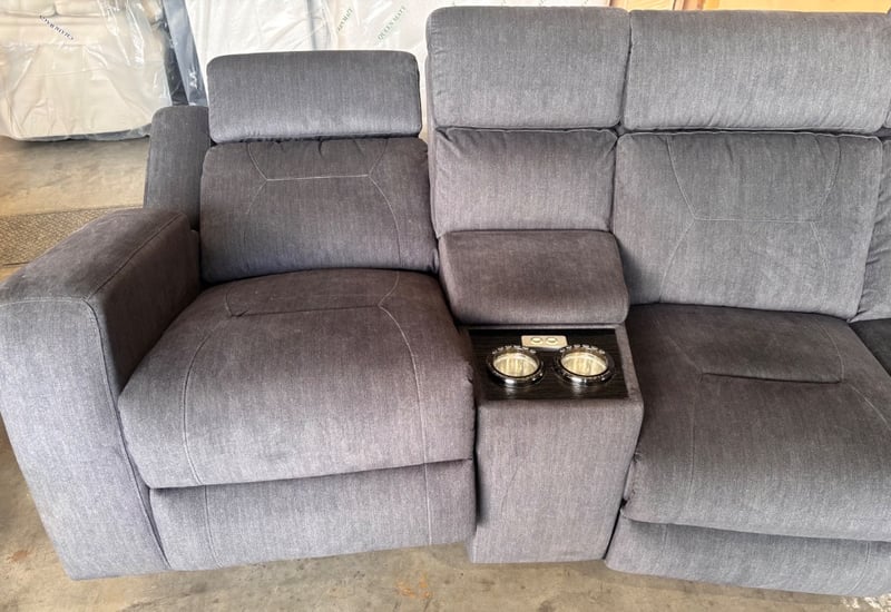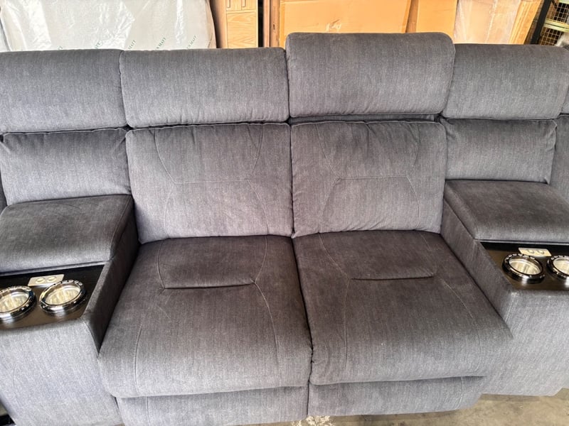4 seater electrical recliner lounge , lava fabric , console, 2 storage, 4 cup holders, reading lights, LED lights Dimensions: 336cm(W) x 96cm (D) x 104cm ( H)Note: minor cleaning required