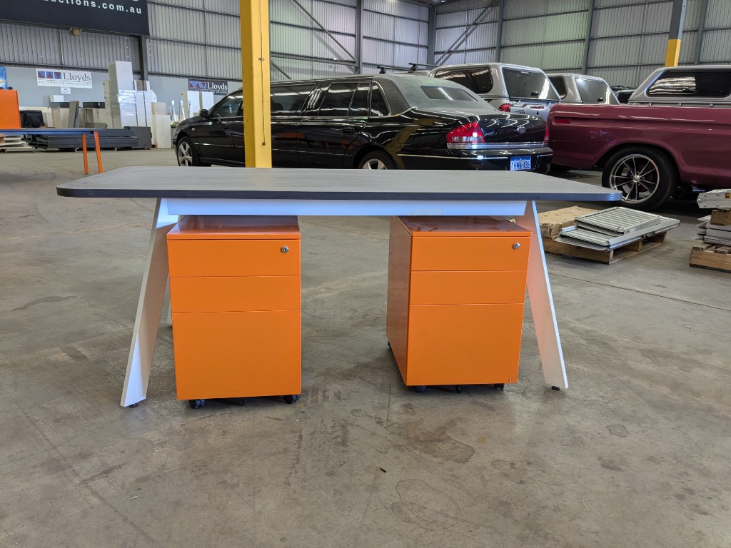 Table and 2 x Orange under desk drawers on wheels. Dimensions (cm): Table: 180W x 72H x 90D Drawers: 40W x 59H x 50D SOLD AS LOT