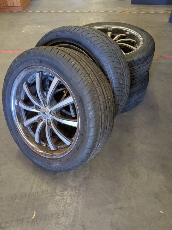 Alloy Mag Rims & Tyres, Set of 2 Front & 2 Back _ Lexani Luxury Alloy Performance Wheels, 275/45R20 110 V XL Hi Fly Vigourous HP 801 & 275/45R20 110 V XL Achilles Desert Hawk UHP with Silver & Black Alloy, FairUsed Condition Tyres, Refer to Images,Note: Some Damages Oxidization &:Grazes to Rim CoatingSold as Lot