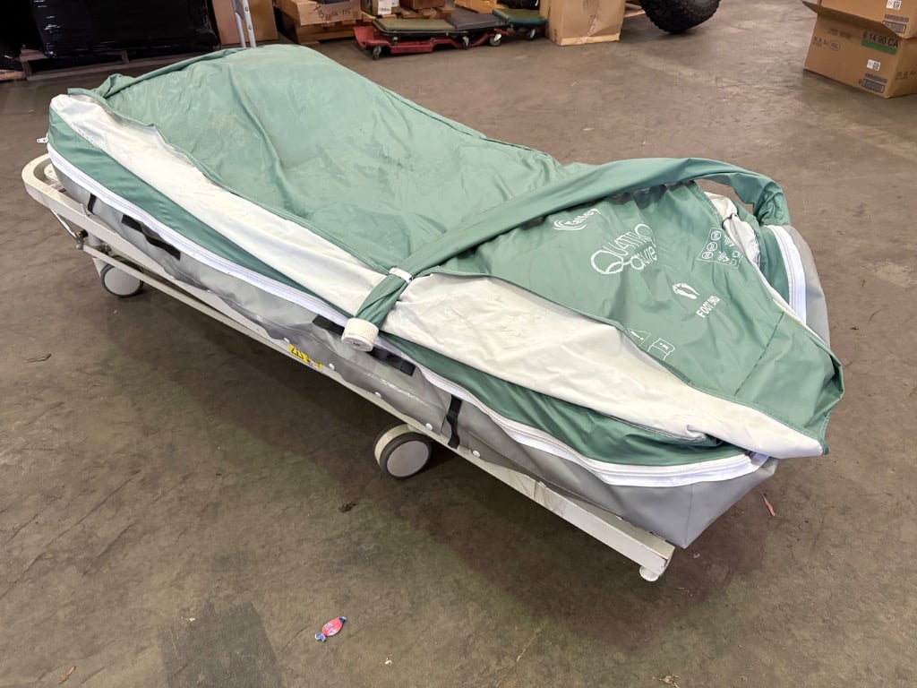 Talley Quattro Acute Therapy Bed System – Model FG50130973Talley Quattro Acute hospital bed system with integrated mattress, Mounted on a wheeled frame for mobility. Brand: Talley Group Limited (UK). Model: FG50130973. Serial No: QAS26821. Manufactured: 2014.Condition: Used. Exterior shows marks, wear, and signs of age. Power cord present. Untested – working condition not confirmed.