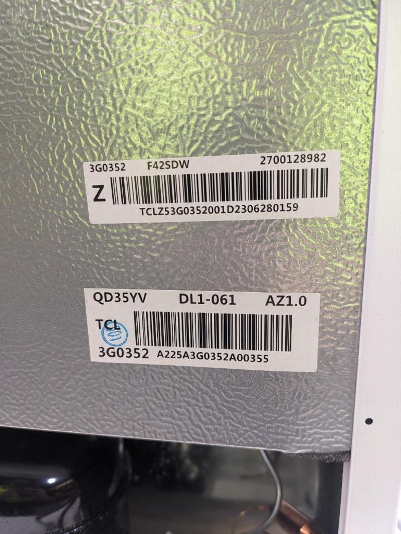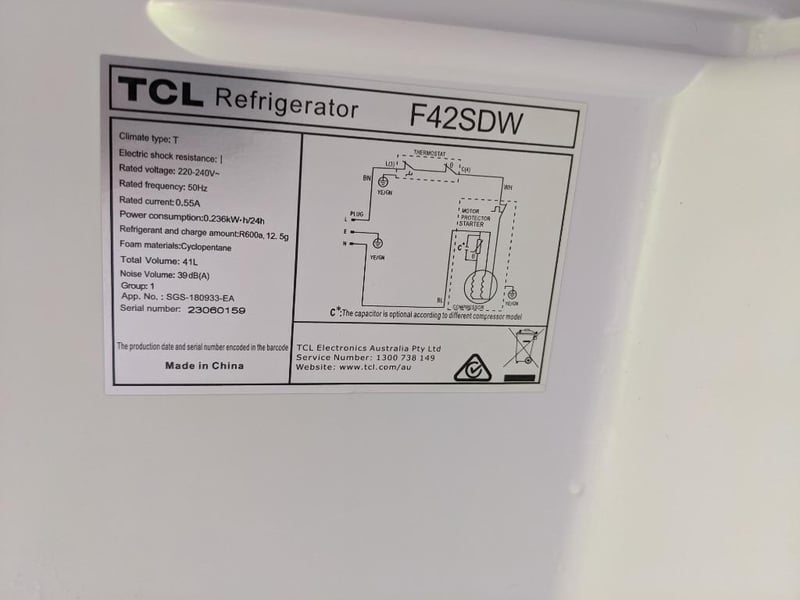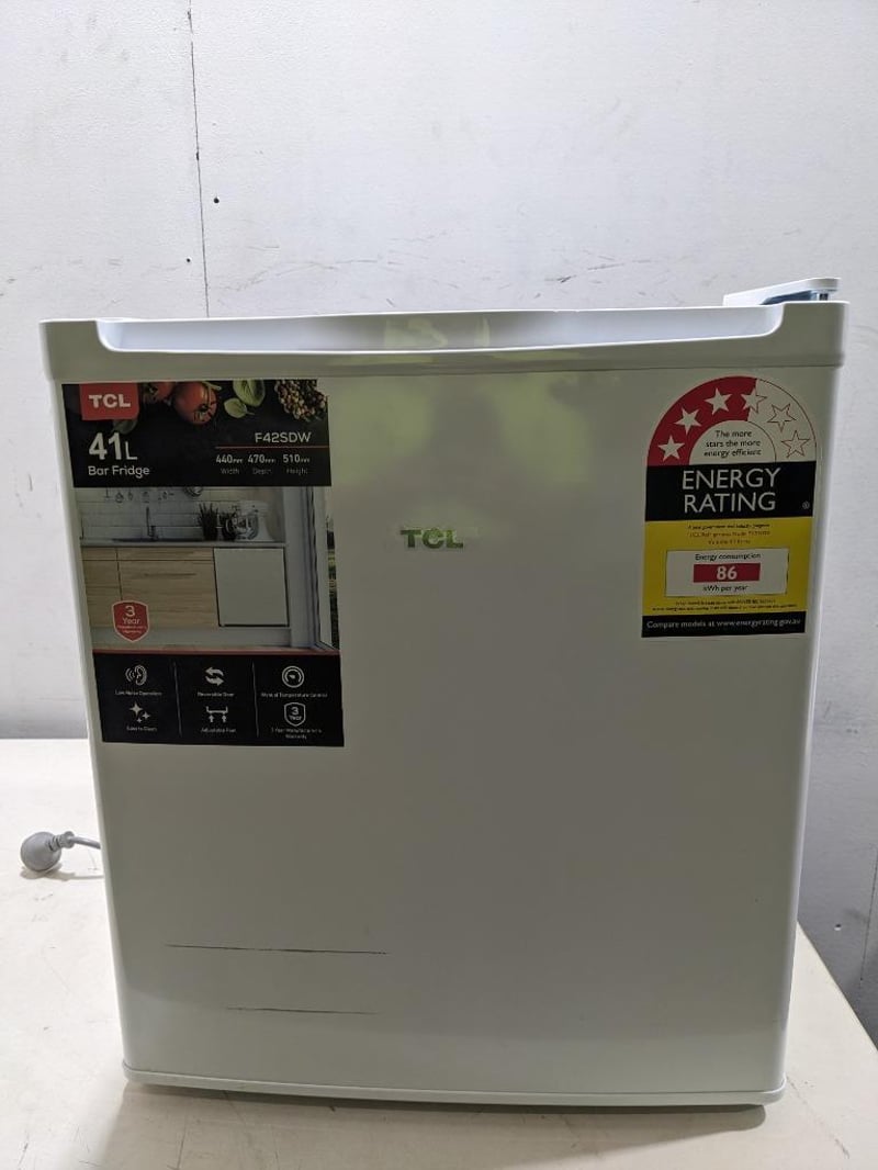 Mini Bar Refrigerator, TCL, F42SDW, 41L, White, S/N: 23060159 Dimensions: (H)52cm x (W)44cm x (D)47cm NOTE: Signs of wear and tear
