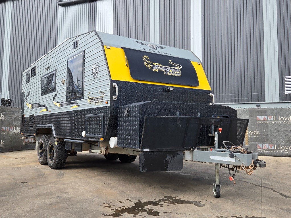 2018 JB Scorpion Sting Caravan Year: 2018 Make: JB Caravans Model: Scorpion Sting Body: Caravan Colour: Yellow/Grey/Black Configuration: Dual Axel Tare: 2819 kg ATM: 3500 kg Description/ extras: Fridge, Seating area, double bed, stove, oven, sinks, toilet, shower, lights, power point VIN: 6T9J21V86H09MS407 Key# B37 Lloyds stock #990543 #Ajax #MMR