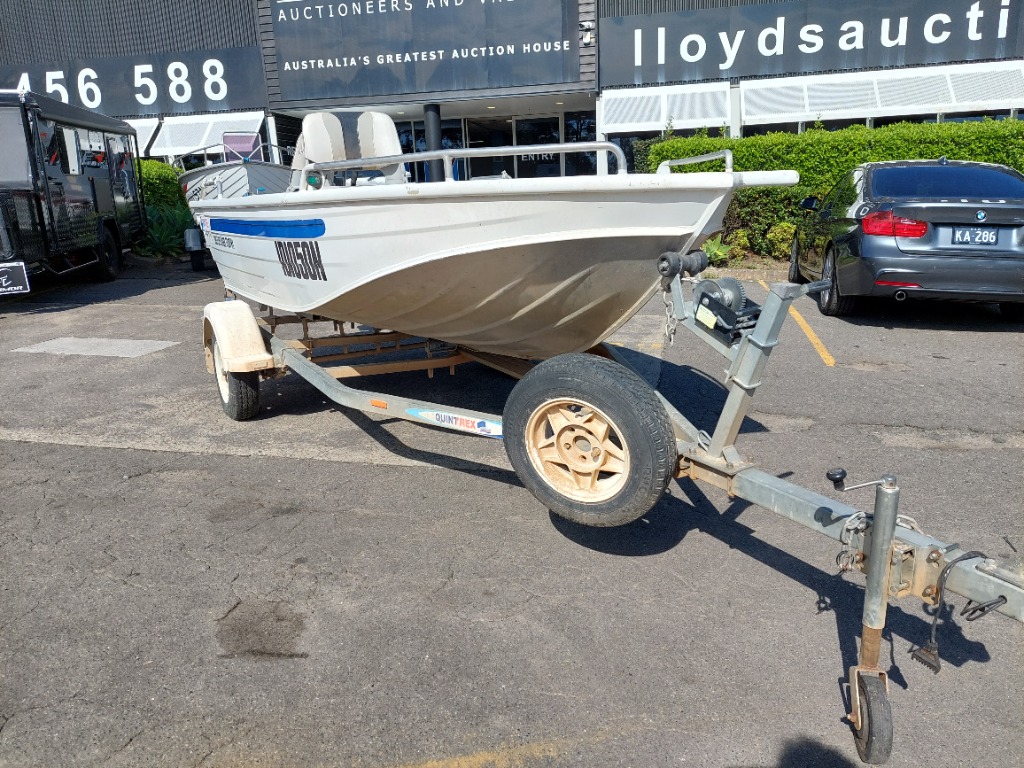 UNRESERVED Quintrex Explorer boat Year: Circa 2000 Make: Quintrex Model: 395 Explorer Trophy (Eclipse) Body: Runabout Hull Material: Aluminium Capacity: 4 Person Colour: White Engine: Yamaha 30 Engine Model: 1013627 Engine no: N432 Engine Hours Indicating: No hours sited Description: 2 × Seats, Live Well , non start , floor in poor condition HIN: AU-TRX93630G708 Vessel length: 4.05m ON A TRAILER: Year: 2007 Make: Telwater Model: TEL46 Body: Boat Trailer Colour: Metal Configuration: single axle Suspension: Leaf Description: Boat Trailer VIN: 6HWBOATRL7C193630 Tare: 240 kg GTM: 749 lg Total length:490cm Trailer width:200cm Total length on trailer: 560xm Key # MMR23 Lloyds stock #581785+1 #MMR