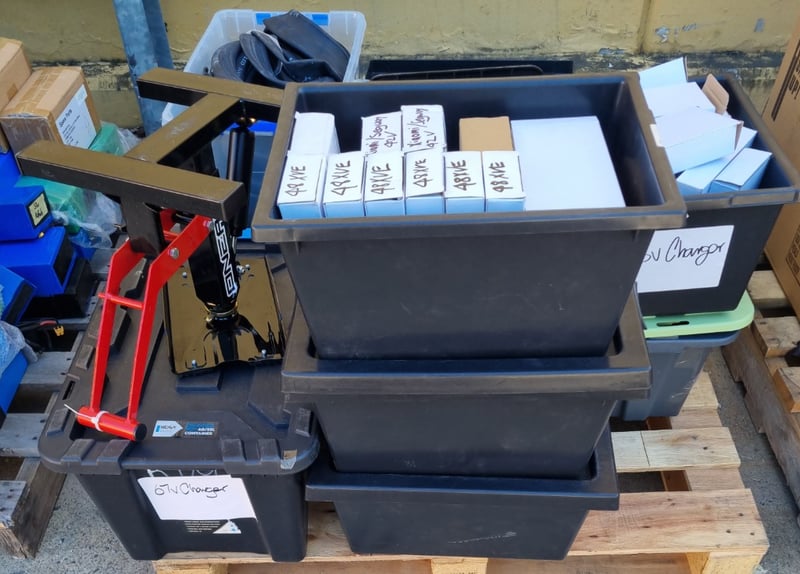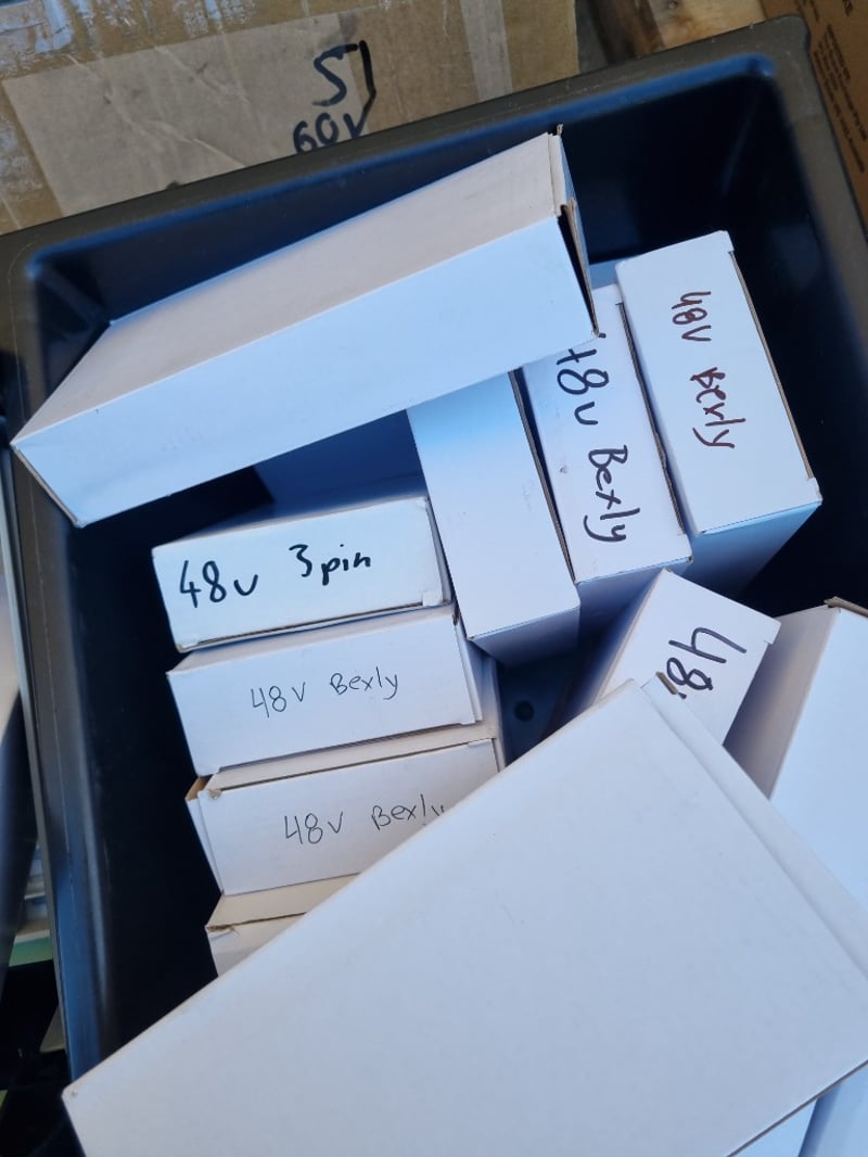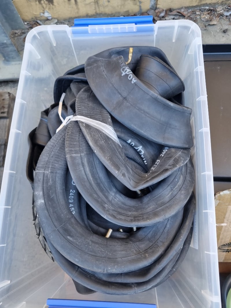 Comprehensive lot of cycling and scooter components including multiple 48V battery packs (XVE and Bexly models), inner tubes in various sizes and more...... Sold as lot