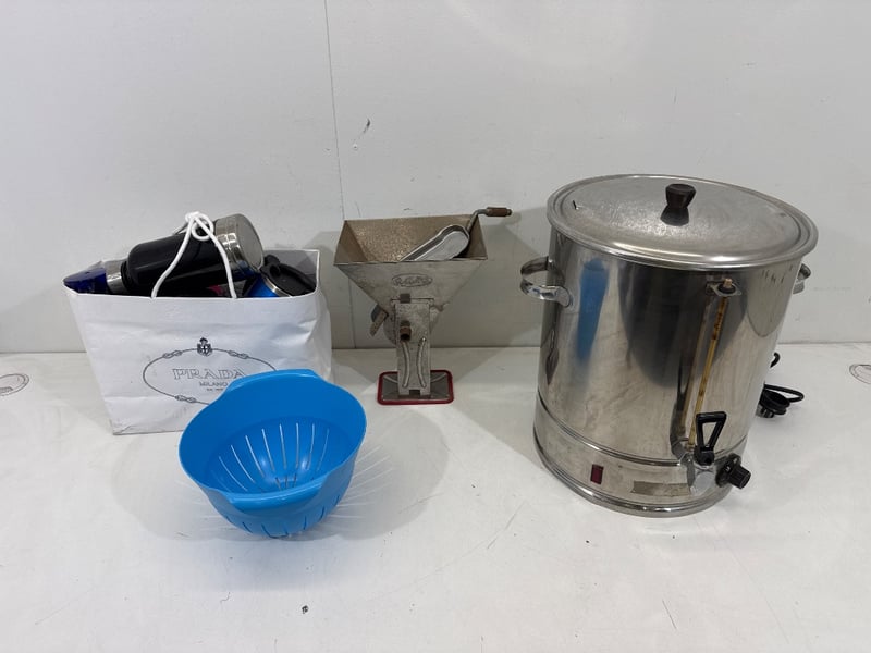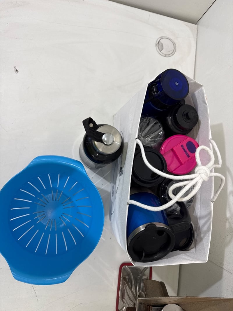 Assorted Kitchen Accessories, brands are Jomack, Omac, ikea ect. Items include Takeaway Cups and Mugs, Strainer, hot water ern and tomato press.