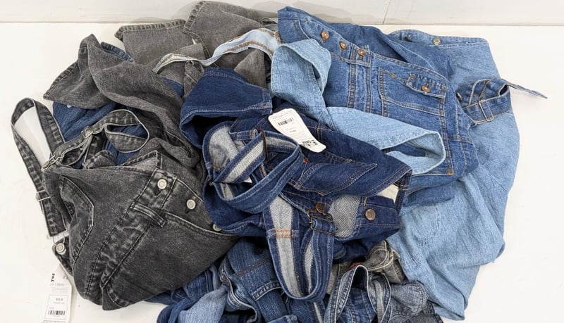 RRP: $600+ , Denim Overalls, assorted styles/ colours/ brands, size; LQuantity: 8 Sold as lot